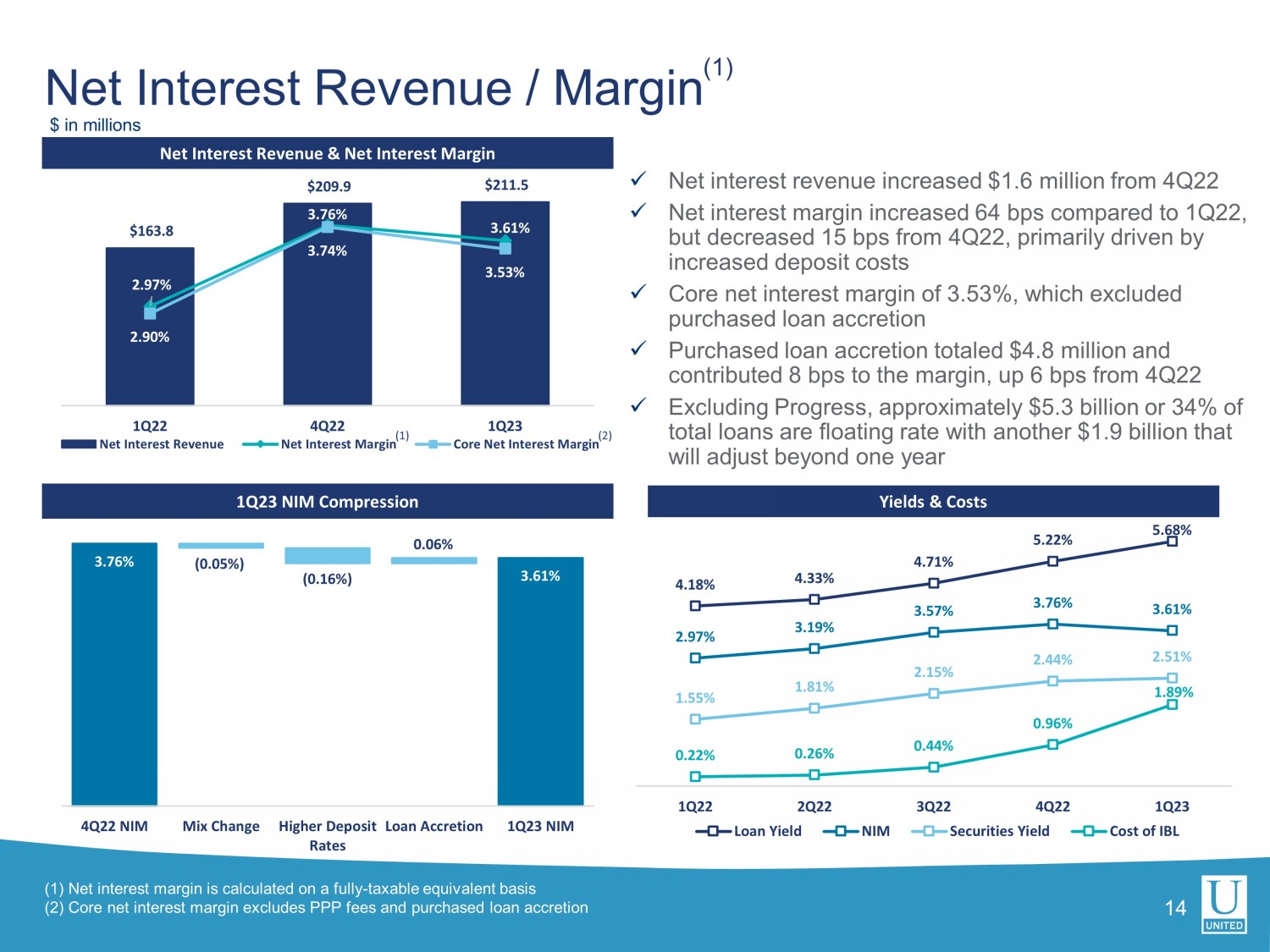 3.61% 3.76% ( 0.05% ) ( 0.16% ) 0.06% 4Q22 NIM Mix Change Higher Deposit Rates Loan Accretion 1Q23 NIM 14 Net Interest Revenue & Net Interest Margin 1Q23 NIM Compression x Net interest revenue increased $1.6 million from 4Q22 x Net interest margin increased 64 bps compared to 1Q22, but decreased 15 bps from 4Q22, primarily driven by increased deposit costs x Core net interest margin of 3.53%, which excluded purchased loan accretion x Purchased loan accretion totaled $4.8 million and contributed 8 bps to the margin, up 6 bps from 4Q22 x Excluding Progress, approximately $5.3 billion or 34% of total loans are floating rate with another $1.9 billion that will adjust beyond one year Net Interest Revenue / Margin (1) Yields & Costs $ in millions 4.18% 4.33% 4.71% 5.22% 5.68% 2.97% 3.19% 3.57% 3.76% 3.61% 1.55% 1.81% 2.15% 2.44% 2.51% 0.22% 0.26% 0.44% 0.96% 1.89% 1Q22 2Q22 3Q22 4Q22 1Q23 Loan Yield NIM Securities Yield Cost of IBL (1) Net interest margin is calculated on a fully - taxable equivalent basis (2) Core net interest margin excludes PPP fees and purchased loan accretion (2) (1) $163.8 $209.9 $211.5 2.97% 3.76% 3.61% 2.90% 3.74% 3.53% $- $50.0 $100.0 $150.0 $200.0 2.00% 2.50% 3.00% 3.50% 4.00% 1Q22 4Q22 1Q23 Net Interest Revenue Net Interest Margin Core Net Interest Margin
