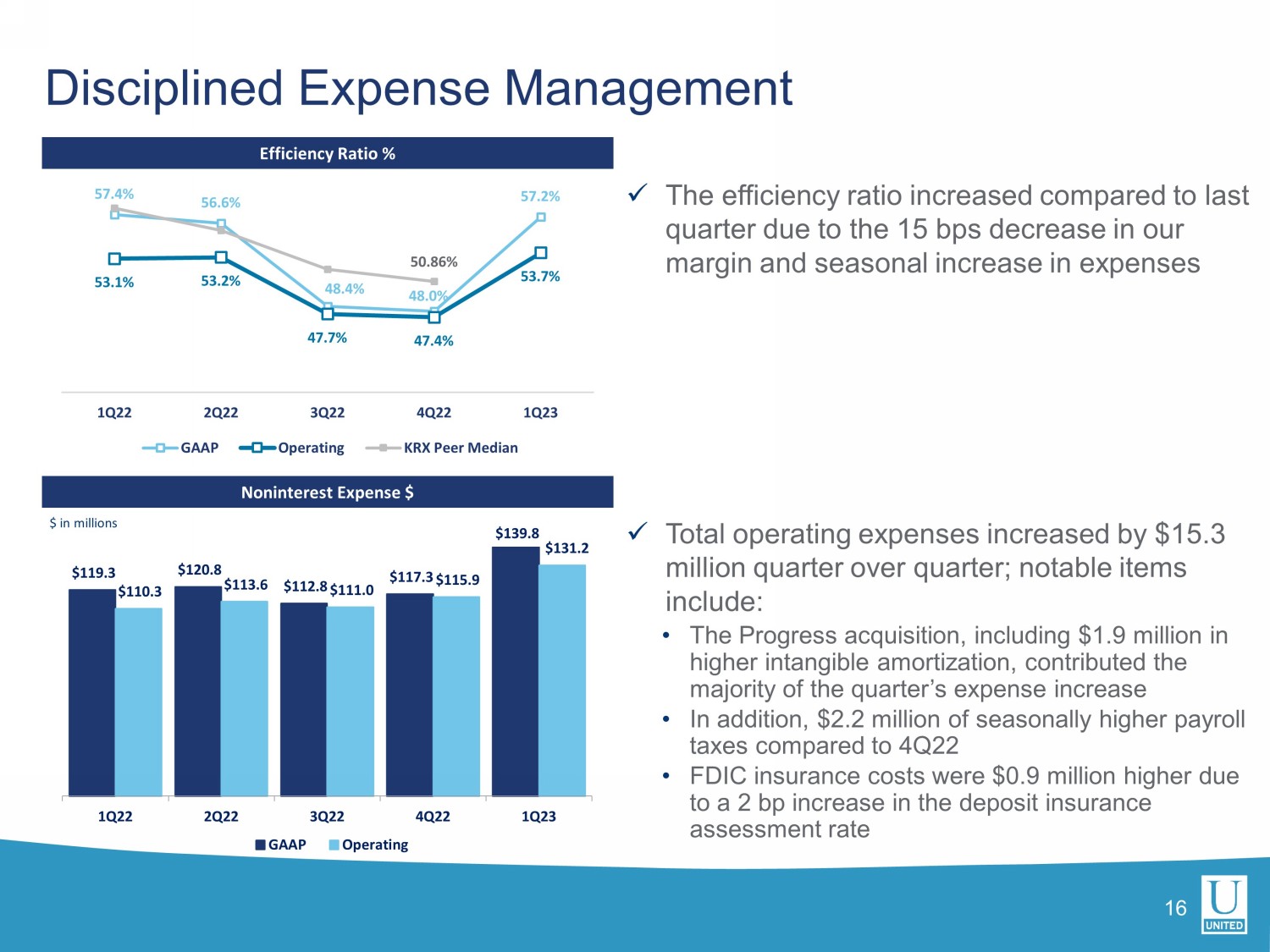 Noninterest Income $ in millions $9.1 $10.0 $9.6 $9.5 $8.7 $16.1 $7.0 $6.3 $3.1 $4.5 $5.9 $6.0 $5.9 $5.8 $5.7 $3.2 $3.8 $2.2 $1.5 $1.9 $4.7 $6.7 $7.9 $13.5 $9.4 1Q22 2Q22 3Q22 4Q22 1Q23 Service Charges Mortgage Brokerage / Wealth Mgmt Loan sale gains Other $39.0 $33.4 $30.2 Linked Quarter x Fees were down $3.2 million • Other income was down $4.1 million due to $3.5 million less in positive equity gains and $1.6 million in 1Q securities losses • A $1.4 million increase in mortgage fees was driven by $1.3 million in higher gains on mortgage sales • MSR write - down of $310,000 in 1Q23 • $1.5 million in 1Q gains on $21.8 million of SBA loans sold compared to $982,000 in gains on $16.9 million loans sold in 4Q22 • SBA / USDA loan originations seasonally decreased $10.1 million to $36.6 million • Gain on sale of equipment finance loans was $394,000 on $18.7 million of loan sales compared to $522,000 in gains on $24.3 million of loan sales in 4Q22 Year - over - Year x Fees were down $8.8 million • Mortgage rate locks of $335 million in 1Q23 compared to $757 million in 1Q22 • Other noninterest income increased $4.7 million due to: • $2.1 million less losses on security sales • $1.0 million increase in loan fees 15 $31.9 $33.5