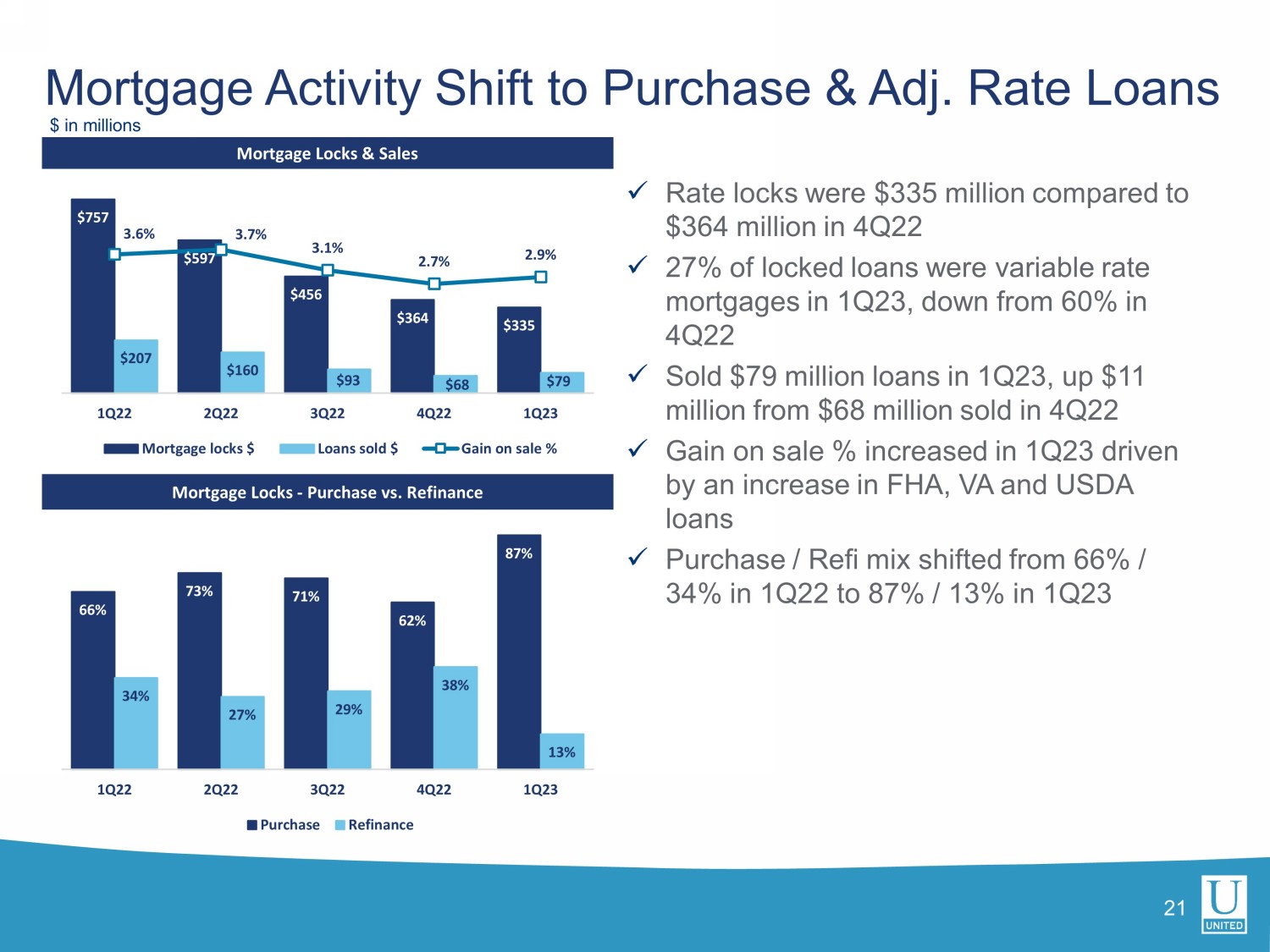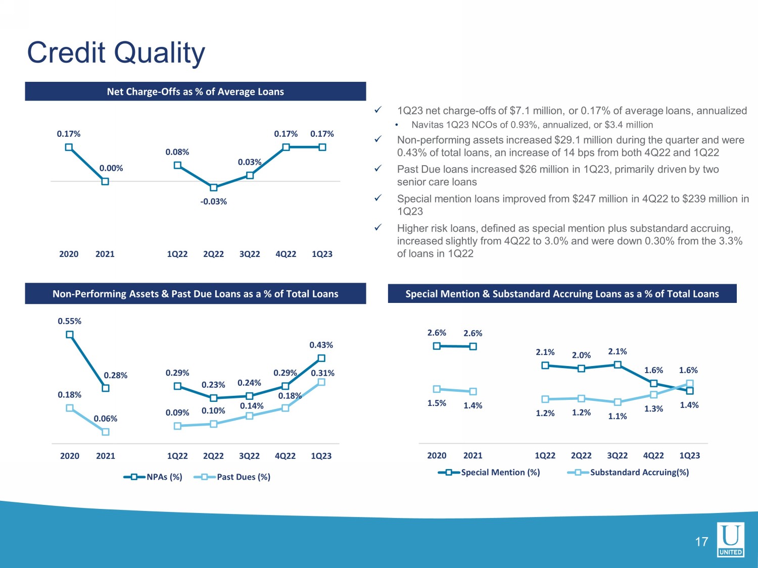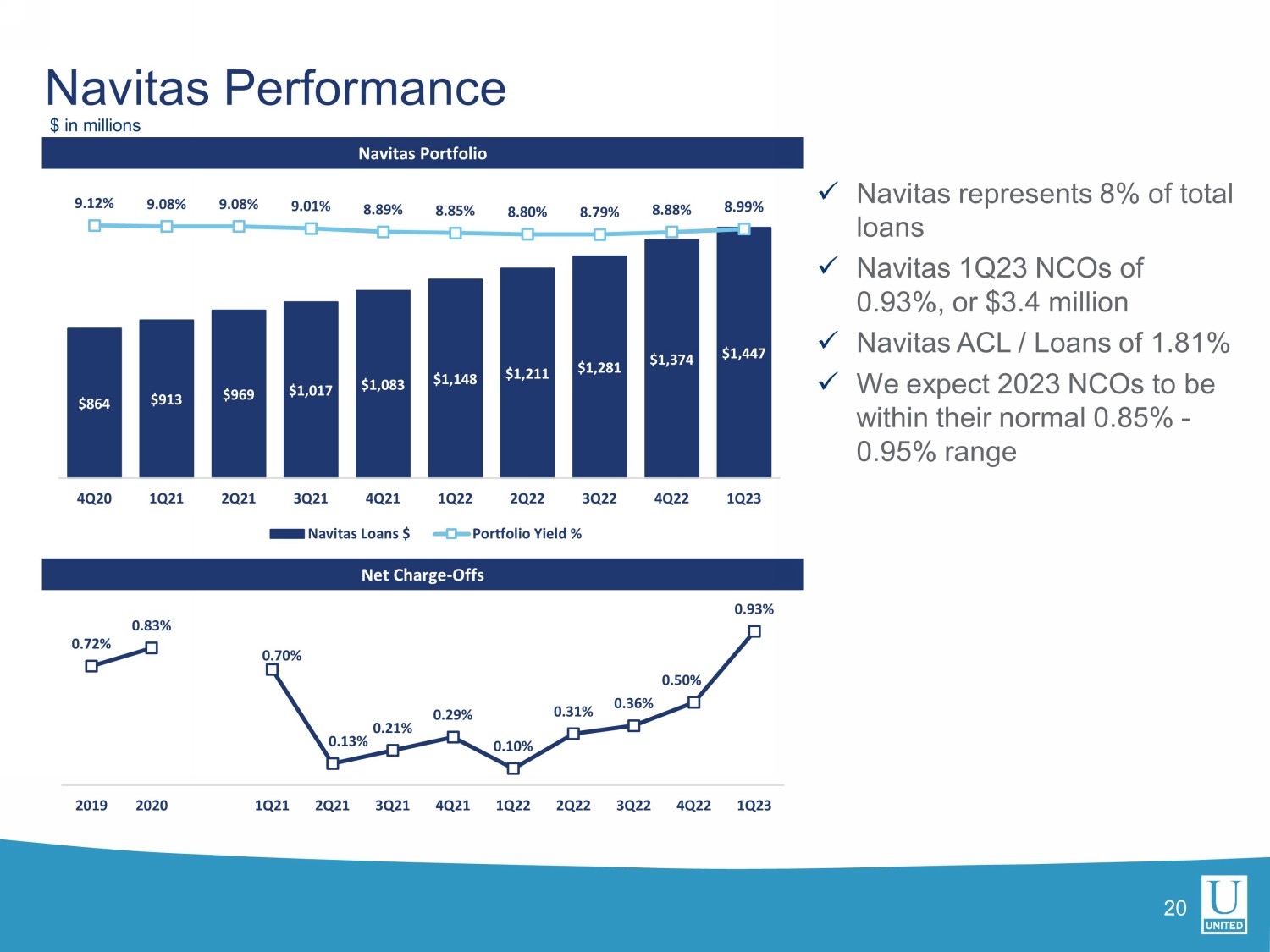 Navitas Portfolio Net Charge - Offs 20 x Navitas represents 8% of total loans x Navitas 1Q23 NCOs of 0.93%, or $3.4 million x Navitas ACL / Loans of 1.81% x We expect 2023 NCOs to be within their normal 0.85% - 0.95% range Navitas Performance $ in millions $864 $913 $969 $1,017 $1,083 $1,148 $1,211 $1,281 $1,374 $1,447 9.12% 9.08% 9.08% 9.01% 8.89% 8.85% 8.80% 8.79% 8.88% 8.99% 0.00% 1.00% 2.00% 3.00% 4.00% 5.00% 6.00% 7.00% 8.00% 9.00% 10.00% $0 $200 $400 $600 $800 $1,000 $1,200 $1,400 $1,600 4Q20 1Q21 2Q21 3Q21 4Q21 1Q22 2Q22 3Q22 4Q22 1Q23 Navitas Loans $ Portfolio Yield % 0.72% 0.83% 0.70% 0.13% 0.21% 0.29% 0.10% 0.31% 0.36% 0.50% 0.93% 2019 2020 1Q21 2Q21 3Q21 4Q21 1Q22 2Q22 3Q22 4Q22 1Q23