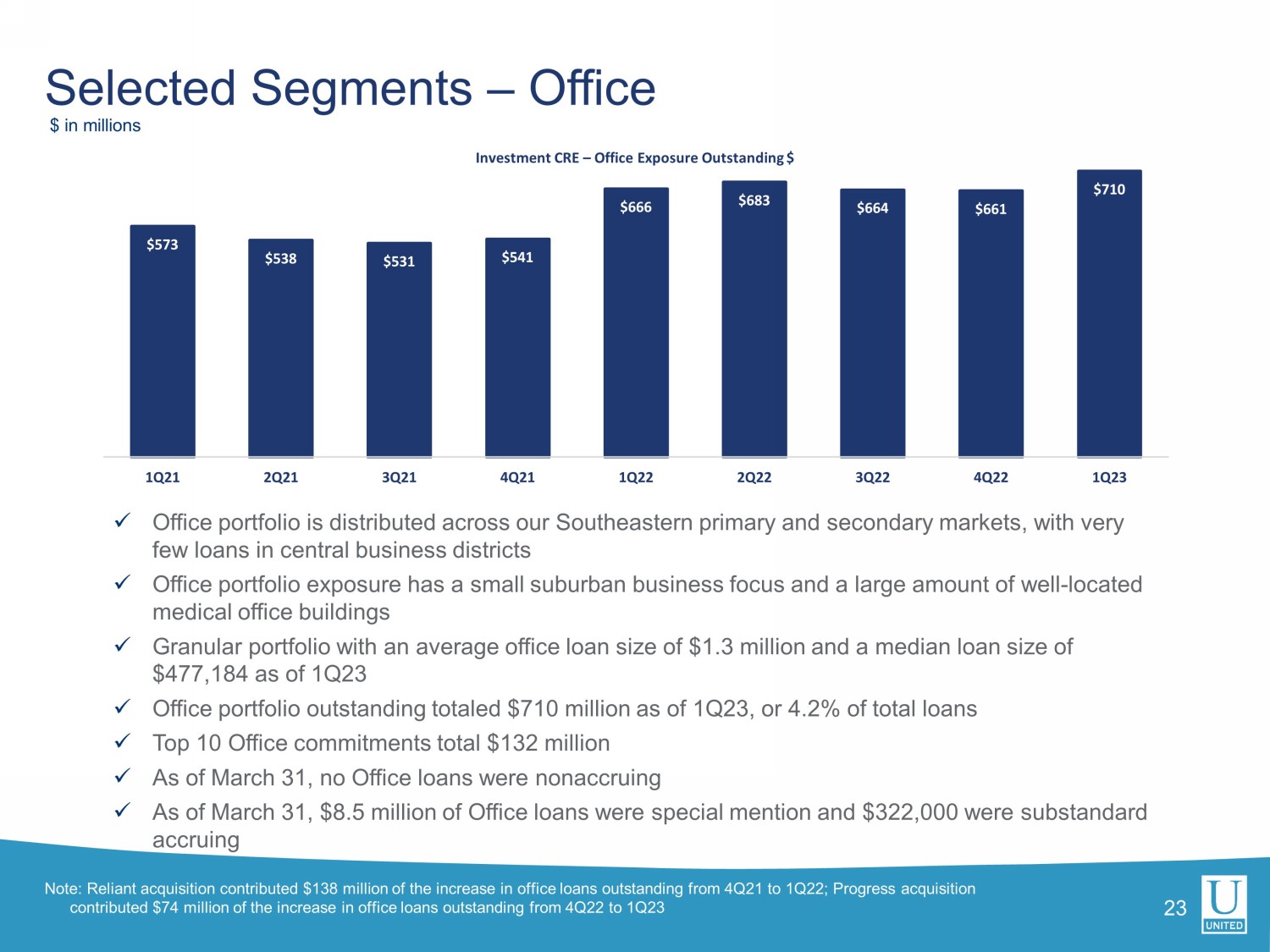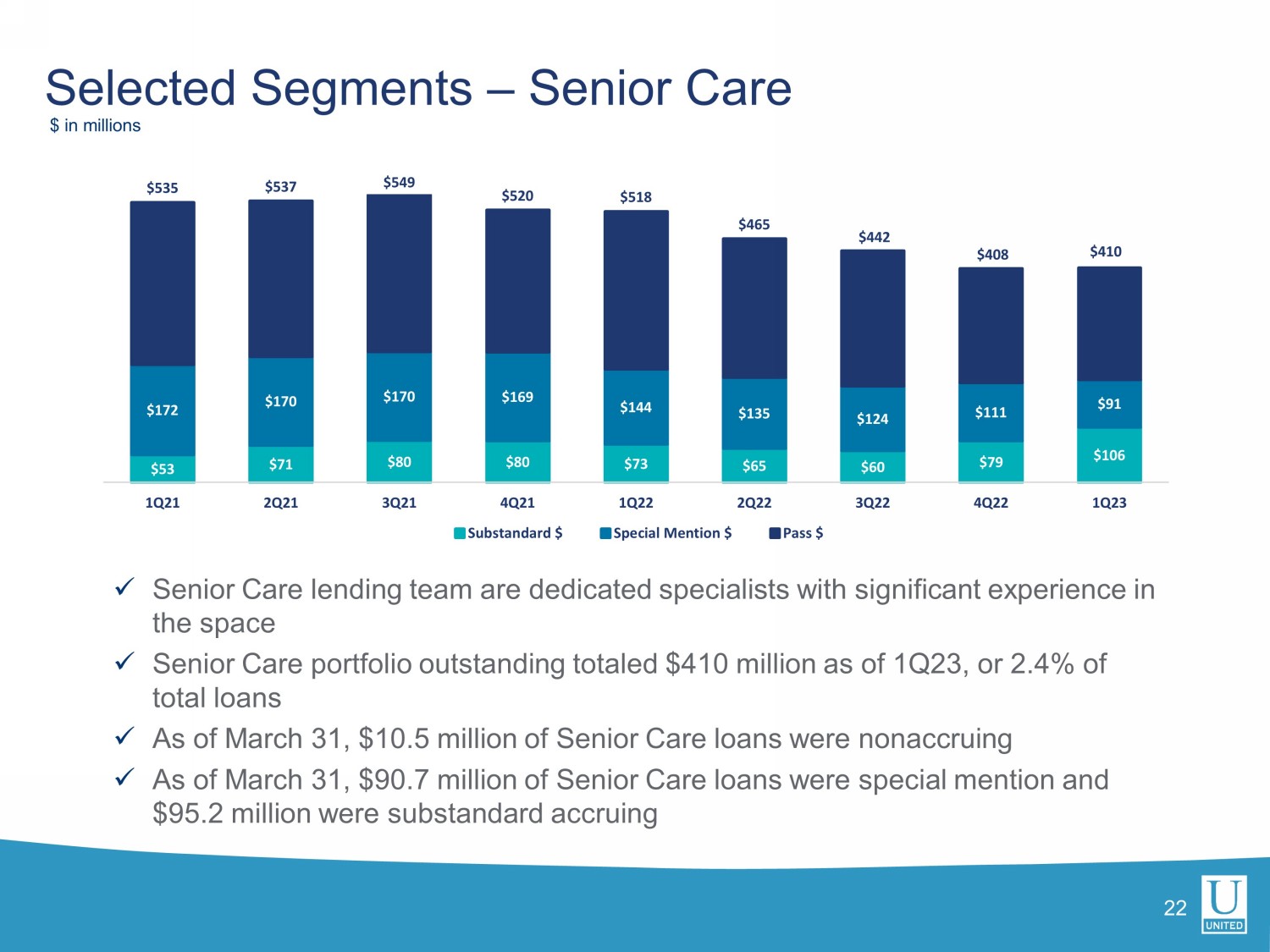 22 x Senior Care lending team are dedicated specialists with significant experience in the space x Senior Care portfolio outstanding totaled $410 million as of 1Q23, or 2.4% of total loans x As of March 31, $10.5 million of Senior Care loans were nonaccruing x As of March 31, $90.7 million of Senior Care loans were special mention and $95.2 million were substandard accruing 1% 20% 25% 49% 6% Selected Segments – Senior Care $ in millions $53 $71 $80 $80 $73 $65 $60 $79 $106 $172 $170 $170 $169 $144 $135 $124 $111 $91 $535 $537 $549 $520 $518 $465 $442 $408 $410 1Q21 2Q21 3Q21 4Q21 1Q22 2Q22 3Q22 4Q22 1Q23 Substandard $ Special Mention $ Pass $