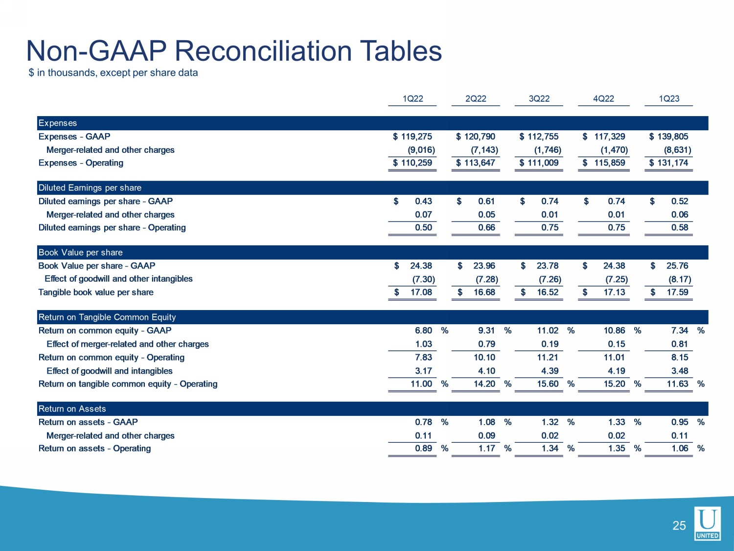 Noninterest - Bearing 25.8% Interest - Bearing 66.7% Retail Time 3.2% Jumbo Time 4.4% C&D 1.2% 1 - 4 Family 17.5% Multifamily 4.7% OO CRE 15.2% NOO CRE 58.2% C&I 2.8% Other 0.4% (1) Consolidated financial data as of December 31, 2022 (2) Bank - level Call Report data as of December 31, 2022 (3) Nonperforming assets defined as nonaccrual loans and leases and real estate owned (4) Deposit data as of December 31, 2022 Note: Dollar values in millions. UCBI branch count includes eight loan production offices Source: S&P Global Market Intelligence, FDIC, Company Documents. Florida First Miami Bancorp, Inc. (3) United Community Banks, Inc. (206) Deposits 2 Loans 2 Acquisition Highlights 4.71% Yield 1.00% Cost Tampa Miami Palm Beach Orlando Sarasota Naples Stuart Melbourne Fort Lauderdale Pro Forma UCBI Miami MSA Presence 8 Branches $1.2B deposits 4 4 th largest MSA based on Pro Forma Deposits Pending Acquisition of First Miami Bancorp, Inc. 24 x $1.0 billion community bank operating in attractive Miami market x 70 - year - old community bank with deep presence and strong relationships in the Miami MSA x Adds greater scale to our wealth management platform by adding approximately $310 million of AUM x EPS accretion in 2024 of ~3%, or $0.09 x Low loan / deposit ratio of 69%; more than $801 million in core deposits x Adds bankers with market expertise and business model centered on delivering excellent customer service x Commitment to credit quality and overall customer service