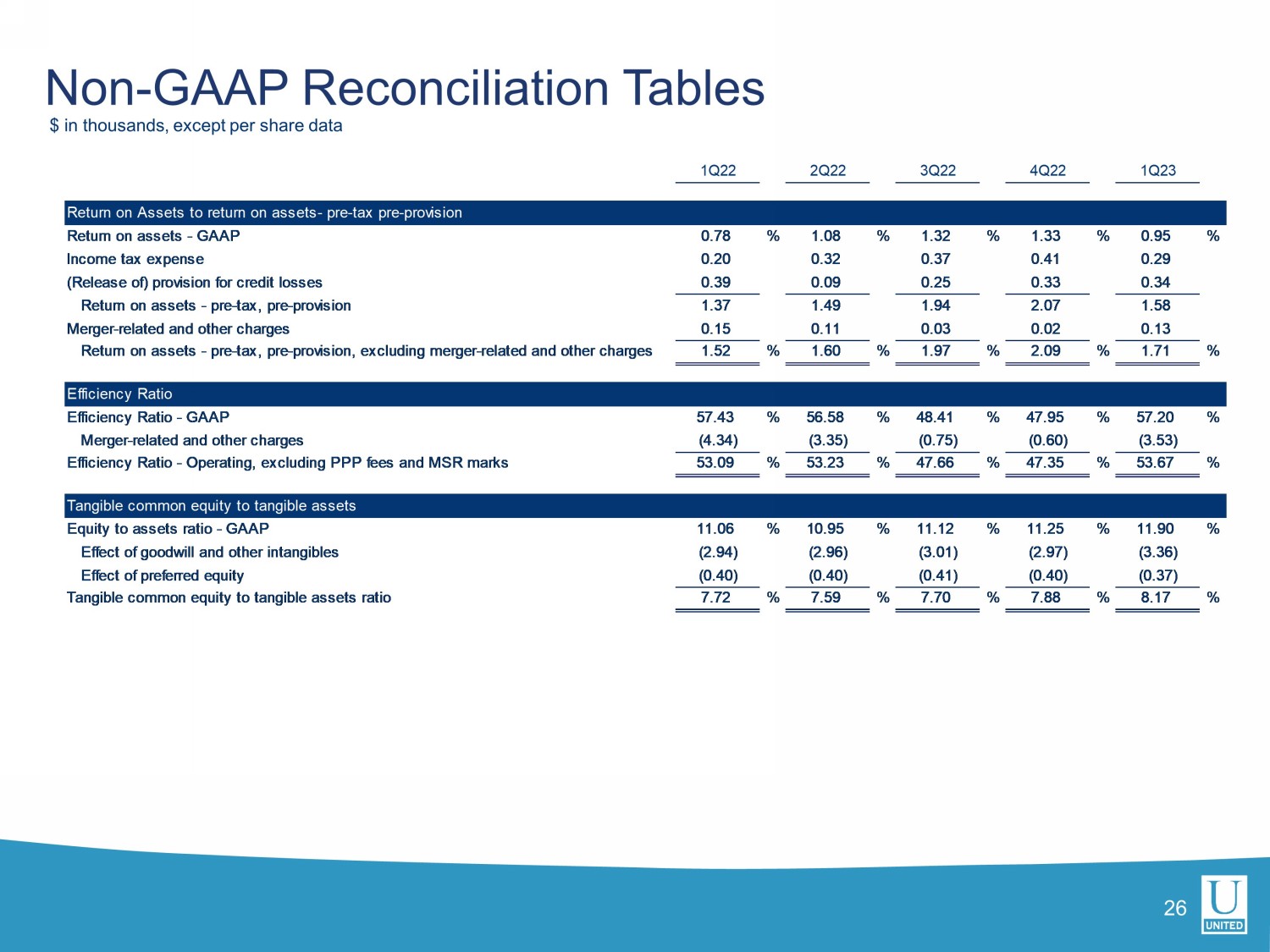 Non - GAAP Reconciliation Tables $ in thousands, except per share data 25 1Q22 2Q22 3Q22 4Q22 1Q23 Expenses Expenses - GAAP 119,275$ 120,790$ 112,755$ 117,329$ 139,805$ Merger-related and other charges (9,016) (7,143) (1,746) (1,470) (8,631) Expenses - Operating 110,259$ 113,647$ 111,009$ 115,859$ 131,174$ Diluted Earnings per share Diluted earnings per share - GAAP 0.43$ 0.61$ 0.74$ 0.74$ 0.52$ Merger-related and other charges 0.07 0.05 0.01 0.01 0.06 Diluted earnings per share - Operating 0.50 0.66 0.75 0.75 0.58 Book Value per share Book Value per share - GAAP 24.38$ 23.96$ 23.78$ 24.38$ 25.76$ Effect of goodwill and other intangibles (7.30) (7.28) (7.26) (7.25) (8.17) Tangible book value per share 17.08$ 16.68$ 16.52$ 17.13$ 17.59$ Return on Tangible Common Equity Return on common equity - GAAP 6.80 % 9.31 % 11.02 % 10.86 % 7.34 % Effect of merger-related and other charges 1.03 0.79 0.19 0.15 0.81 Return on common equity - Operating 7.83 10.10 11.21 11.01 8.15 Effect of goodwill and intangibles 3.17 4.10 4.39 4.19 3.48 Return on tangible common equity - Operating 11.00 % 14.20 % 15.60 % 15.20 % 11.63 % Return on Assets Return on assets - GAAP 0.78 % 1.08 % 1.32 % 1.33 % 0.95 % Merger-related and other charges 0.11 0.09 0.02 0.02 0.11 Return on assets - Operating 0.89 % 1.17 % 1.34 % 1.35 % 1.06 %