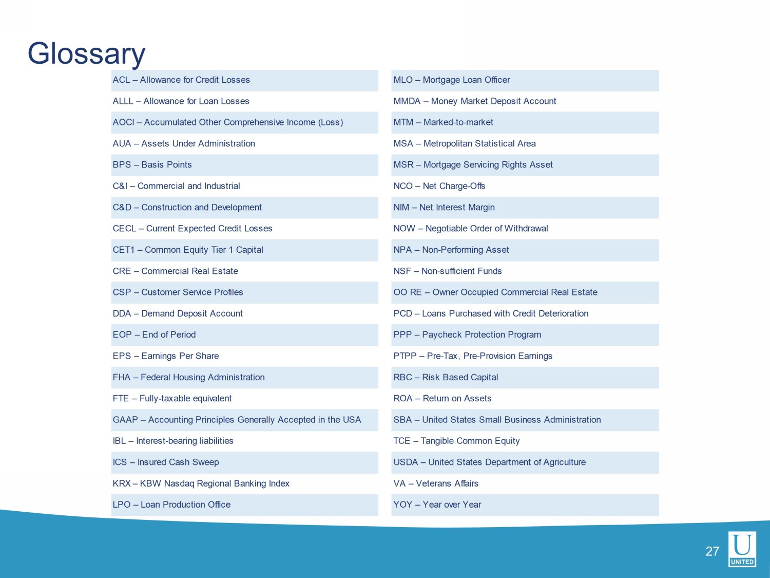 Glossary 27 ACL – Allowance for Credit Losses MLO – Mortgage Loan Officer ALLL – Allowance for Loan Losses MMDA – Money Market Deposit Account AOCI – Accumulated Other Comprehensive Income (Loss) MTM – Marked-to-market AUA – Assets Under Administration MSA – Metropolitan Statistical Area BPS – Basis Points MSR – Mortgage Servicing Rights Asset C&I – Commercial and Industrial NCO – Net Charge-Offs C&D – Construction and Development NIM – Net Interest Margin CECL – Current Expected Credit Losses NOW – Negotiable Order of Withdrawal CET1 – Common Equity Tier 1 Capital NPA – Non-Performing Asset CRE – Commercial Real Estate NSF – Non-sufficient Funds CSP – Customer Service Profiles OO RE – Owner Occupied Commercial Real Estate DDA – Demand Deposit Account PCD – Loans Purchased with Credit Deterioration EOP – End of Period PPP – Paycheck Protection Program EPS – Earnings Per Share PTPP – Pre-Tax, Pre-Provision Earnings FHA – Federal Housing Administration RBC – Risk Based Capital FTE – Fully-taxable equivalent ROA – Return on Assets GAAP – Accounting Principles Generally Accepted in the USA SBA – United States Small Business Administration IBL – Interest-bearing liabilities TCE – Tangible Common Equity ICS – Insured Cash Sweep USDA – United States Department of Agriculture KRX – KBW Nasdaq Regional Banking Index VA – Veterans Affairs LPO – Loan Production Office YOY – Year over Year