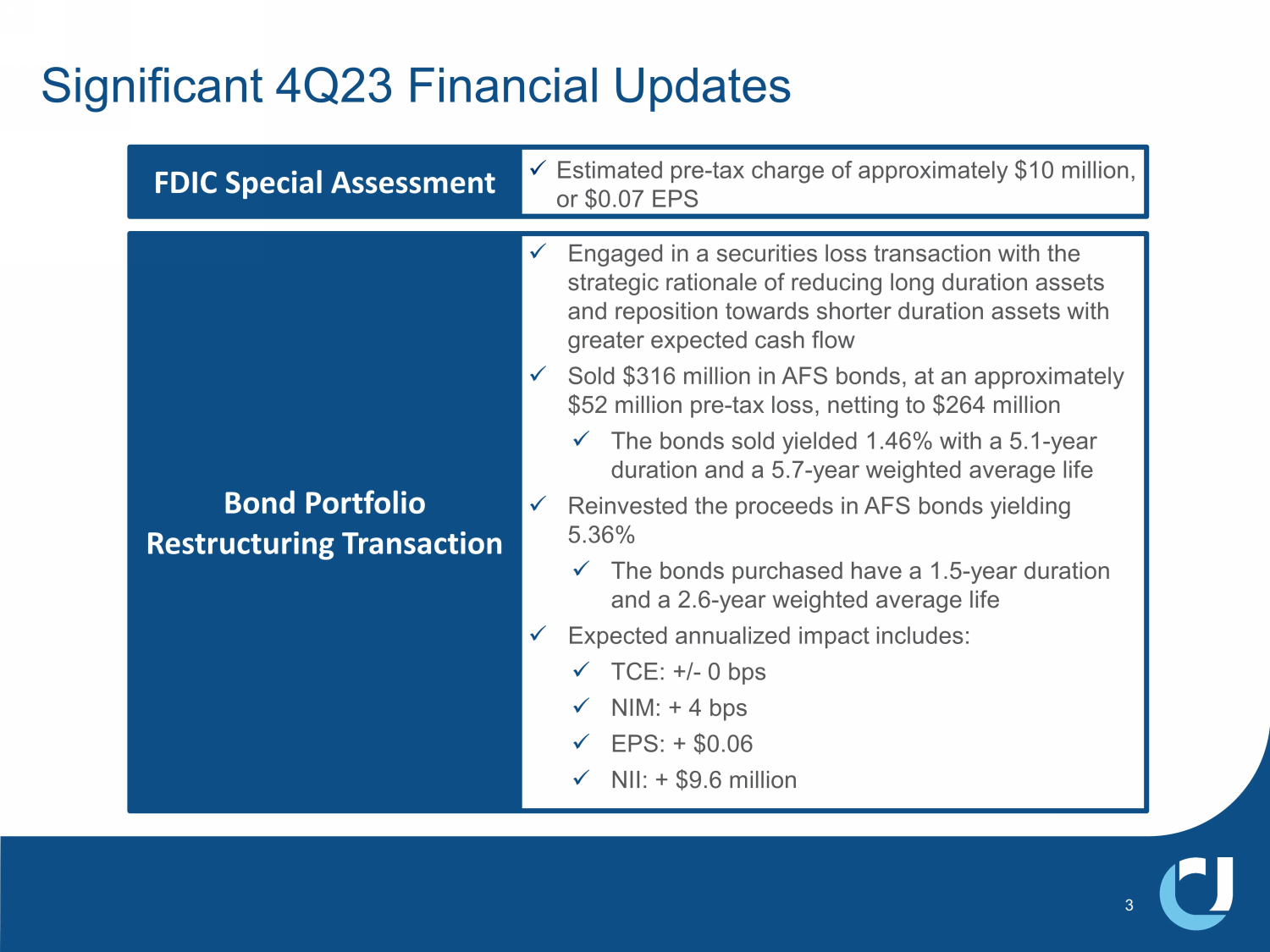 x Estimated pre - tax charge of approximately $10 million, or $0.07 EPS Significant 4Q23 Financial Updates FDIC Special Assessment 3 x Engaged in a securities loss transaction with the strategic rationale of reducing long duration assets and reposition towards shorter duration assets with greater expected cash flow x Sold $316 million in AFS bonds, at an approximately $52 million pre - tax loss, netting to $264 million x The bonds sold yielded 1.46% with a 5.1 - year duration and a 5.7 - year weighted average life x Reinvested the proceeds in AFS bonds yielding 5.36% x The bonds purchased have a 1.5 - year duration and a 2.6 - year weighted average life x Expected annualized impact includes: x TCE: +/ - 0 bps x NIM: + 4 bps x EPS: + $0.06 x NII: + $9.6 million Bond Portfolio Restructuring Transaction
