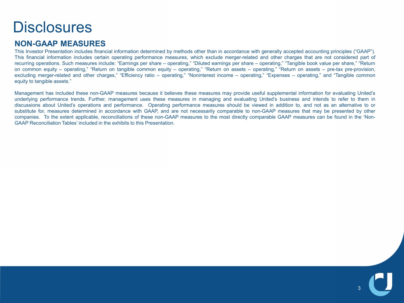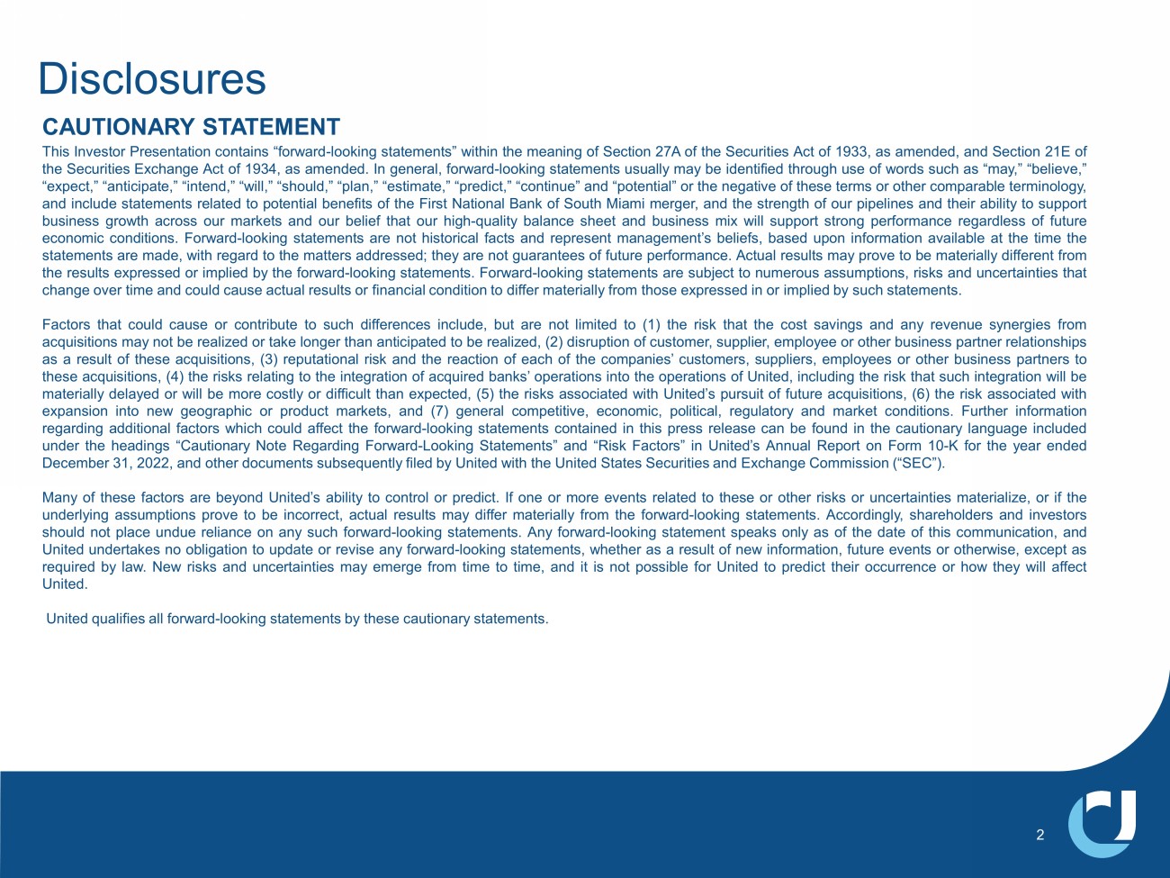 Disclosures 2 CAUTIONARY STATEMENT This Investor Presentation contains “forward - looking statements” within the meaning of Section 27 A of the Securities Act of 1933 , as amended, and Section 21 E of the Securities Exchange Act of 1934 , as amended . In general, forward - looking statements usually may be identified through use of words such as “may,” “believe,” “expect,” “anticipate,” “intend,” “will,” “should,” “plan,” “estimate,” “predict,” “continue” and “potential” or the negative of these terms or other comparable terminology, and include statements related to potential benefits of the First National Bank of South Miami merger, and the strength of our pipelines and their ability to support business growth across our markets and our belief that our high - quality balance sheet and business mix will support strong performance regardless of future economic conditions . Forward - looking statements are not historical facts and represent management’s beliefs, based upon information available at the time the statements are made, with regard to the matters addressed; they are not guarantees of future performance . Actual results may prove to be materially different from the results expressed or implied by the forward - looking statements . Forward - looking statements are subject to numerous assumptions, risks and uncertainties that change over time and could cause actual results or financial condition to differ materially from those expressed in or implied by such statements . Factors that could cause or contribute to such differences include, but are not limited to ( 1 ) the risk that the cost savings and any revenue synergies from acquisitions may not be realized or take longer than anticipated to be realized, ( 2 ) disruption of customer, supplier, employee or other business partner relationships as a result of these acquisitions, ( 3 ) reputational risk and the reaction of each of the companies’ customers, suppliers, employees or other business partners to these acquisitions, ( 4 ) the risks relating to the integration of acquired banks’ operations into the operations of United, including the risk that such integration will be materially delayed or will be more costly or difficult than expected, ( 5 ) the risks associated with United’s pursuit of future acquisitions, ( 6 ) the risk associated with expansion into new geographic or product markets, and ( 7 ) general competitive, economic, political, regulatory and market conditions . Further information regarding additional factors which could affect the forward - looking statements contained in this press release can be found in the cautionary language included under the headings “Cautionary Note Regarding Forward - Looking Statements” and “Risk Factors” in United’s Annual Report on Form 10 - K for the year ended December 31 , 2022 , and other documents subsequently filed by United with the United States Securities and Exchange Commission (“SEC”) . Many of these factors are beyond United’s ability to control or predict . If one or more events related to these or other risks or uncertainties materialize, or if the underlying assumptions prove to be incorrect, actual results may differ materially from the forward - looking statements . Accordingly, shareholders and investors should not place undue reliance on any such forward - looking statements . Any forward - looking statement speaks only as of the date of this communication, and United undertakes no obligation to update or revise any forward - looking statements, whether as a result of new information, future events or otherwise, except as required by law . New risks and uncertainties may emerge from time to time, and it is not possible for United to predict their occurrence or how they will affect United . United qualifies all forward - looking statements by these cautionary statements .