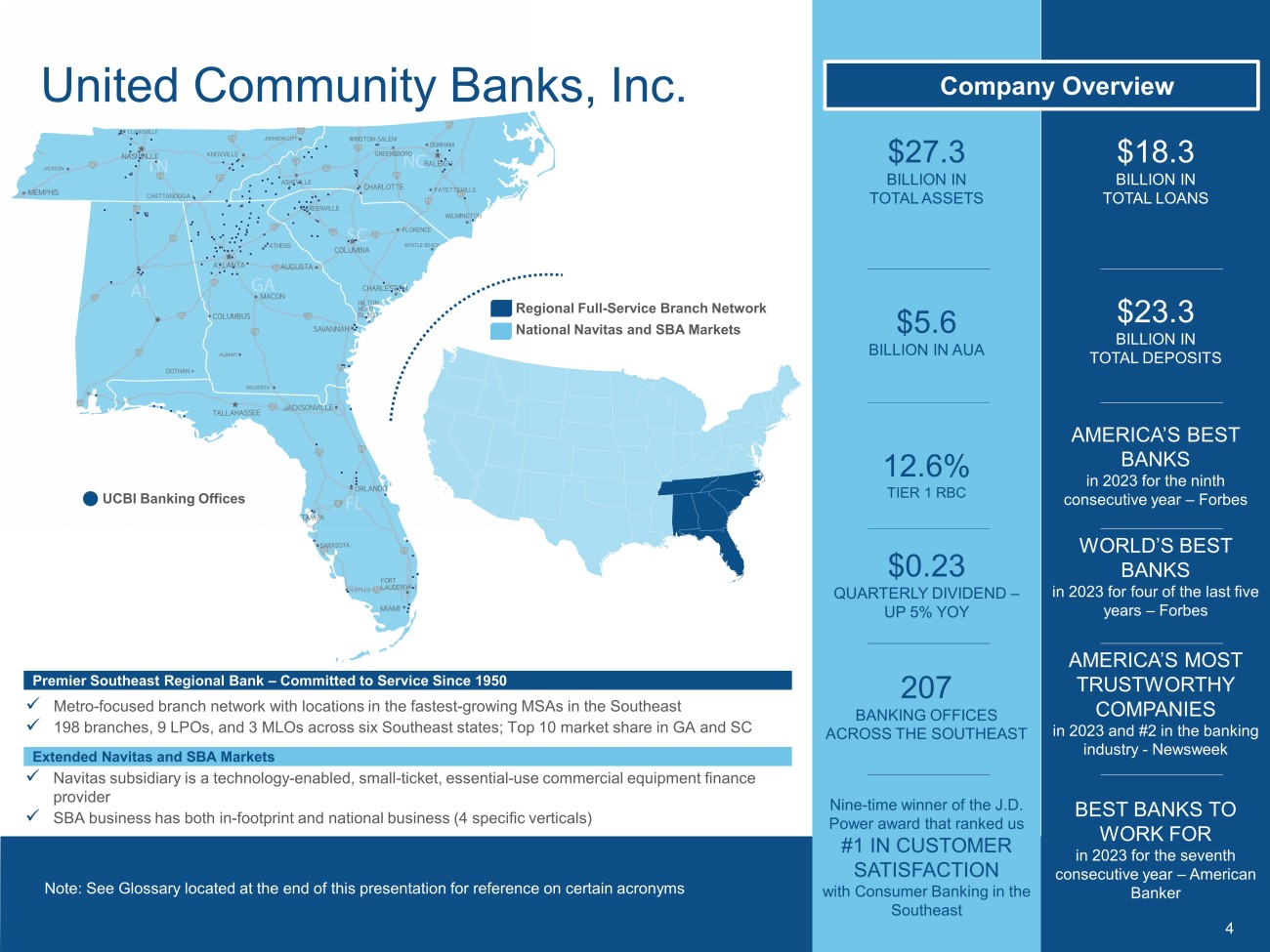 Disclosures 3 NON - GAAP MEASURES This Investor Presentation includes financial information determined by methods other than in accordance with generally accepted accounting principles (“GAAP”) . This financial information includes certain operating performance measures, which exclude merger - related and other charges that are not considered part of recurring operations . Such measures include : “Earnings per share – operating,” “Diluted earnings per share – operating,” “Tangible book value per share,” “Return on common equity – operating,” “Return on tangible common equity – operating,” “Return on assets – operating,” “Return on assets – pre - tax pre - provision, excluding merger - related and other charges,” “Efficiency ratio – operating,” “Noninterest income – operating,” “Expenses – operating,” and “Tangible common equity to tangible assets . ” Management has included these non - GAAP measures because it believes these measures may provide useful supplemental information for evaluating United’s underlying performance trends . Further, management uses these measures in managing and evaluating United’s business and intends to refer to them in discussions about United’s operations and performance . Operating performance measures should be viewed in addition to, and not as an alternative to or substitute for, measures determined in accordance with GAAP, and are not necessarily comparable to non - GAAP measures that may be presented by other companies . To the extent applicable, reconciliations of these non - GAAP measures to the most directly comparable GAAP measures can be found in the ‘Non - GAAP Reconciliation Tables’ included in the exhibits to this Presentation .