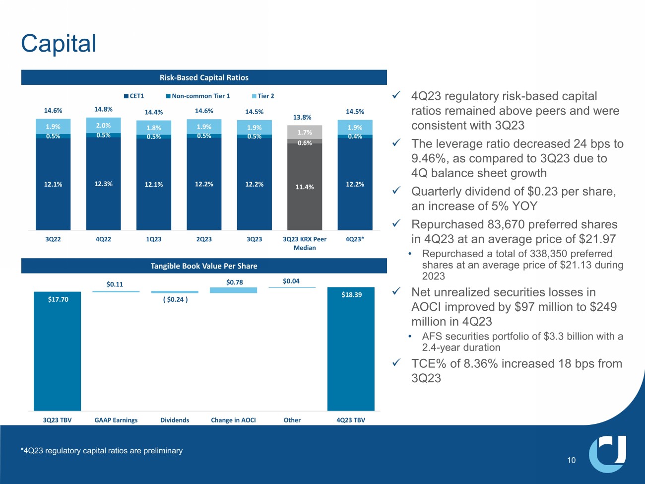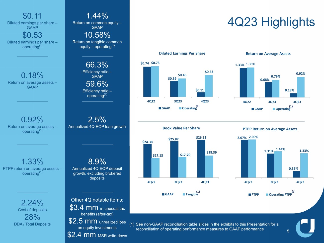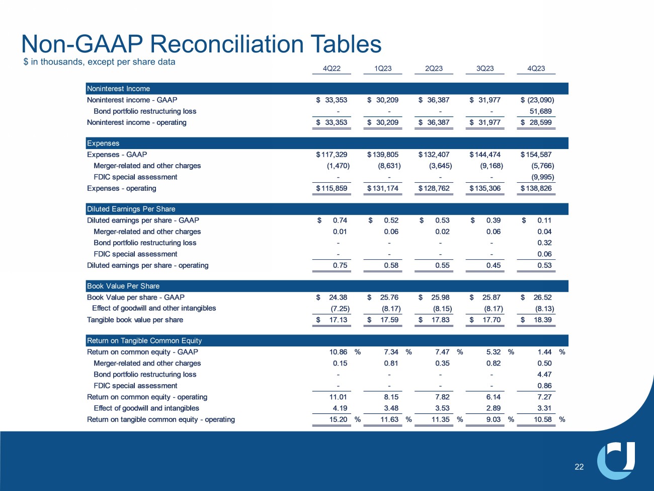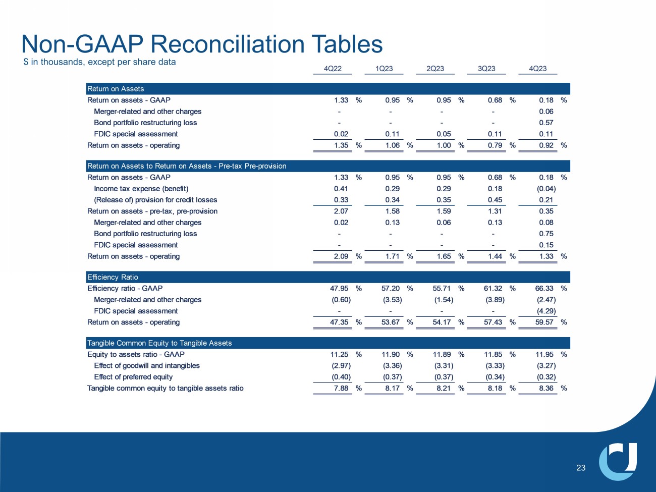 Non - GAAP Reconciliation Tables 22 4Q22 1Q23 2Q23 3Q23 4Q23 Noninterest Income Noninterest income - GAAP 33,353$ 30,209$ 36,387$ 31,977$ (23,090)$ Bond portfolio restructuring loss - - - - 51,689 Noninterest income - operating 33,353$ 30,209$ 36,387$ 31,977$ 28,599$ Expenses Expenses - GAAP 117,329$ 139,805$ 132,407$ 144,474$ 154,587$ Merger-related and other charges (1,470) (8,631) (3,645) (9,168) (5,766) FDIC special assessment - - - - (9,995) Expenses - operating 115,859$ 131,174$ 128,762$ 135,306$ 138,826$ Diluted Earnings Per Share Diluted earnings per share - GAAP 0.74$ 0.52$ 0.53$ 0.39$ 0.11$ Merger-related and other charges 0.01 0.06 0.02 0.06 0.04 Bond portfolio restructuring loss - - - - 0.32 FDIC special assessment - - - - 0.06 Diluted earnings per share - operating 0.75 0.58 0.55 0.45 0.53 Book Value Per Share Book Value per share - GAAP 24.38$ 25.76$ 25.98$ 25.87$ 26.52$ Effect of goodwill and other intangibles (7.25) (8.17) (8.15) (8.17) (8.13) Tangible book value per share 17.13$ 17.59$ 17.83$ 17.70$ 18.39$ Return on Tangible Common Equity Return on common equity - GAAP 10.86 % 7.34 % 7.47 % 5.32 % 1.44 % Merger-related and other charges 0.15 0.81 0.35 0.82 0.50 Bond portfolio restructuring loss - - - - 4.47 FDIC special assessment - - - - 0.86 Return on common equity - operating 11.01 8.15 7.82 6.14 7.27 Effect of goodwill and intangibles 4.19 3.48 3.53 2.89 3.31 Return on tangible common equity - operating 15.20 % 11.63 % 11.35 % 9.03 % 10.58 % $ in thousands, except per share data