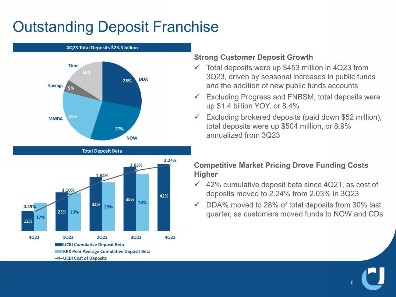 2.5% Annualized 4Q EOP loan growth $0.74 $0.39 $0.11 $0.75 $0.45 $0.53 4Q22 3Q23 4Q23 Diluted Earnings Per Share GAAP Operating (1) 8.9% Annualized 4Q EOP deposit growth, excluding brokered deposits $24.38 $25.87 $26.52 $17.13 $17.70 $18.39 4Q22 3Q23 4Q23 Book Value Per Share GAAP Tangible 1.44% Return on common equity – GAAP 10.58% Return on tangible common equity – operating (1) Other 4Q notable items: $3.4 mm in unusual tax benefits (after - tax) $2.5 mm unrealized loss on equity investments $2.4 mm MSR write - down 0.92% Return on average assets – operating (1) 1.33% PTPP return on average assets – operating (1) 2.24% Cost of deposits 28% DDA / Total Deposits $0.11 Diluted earnings per share – GAAP $0.53 Diluted earnings per share – operating (1) 0.18% Return on average assets – GAAP 4Q23 Highlights (1) See non - GAAP reconciliation table slides in the exhibits to this Presentation for a reconciliation of operating performance measures to GAAP performance 1.33% 0.68% 0.18% 1.35% 0.79% 0.92% 4Q22 3Q23 4Q23 Return on Average Assets GAAP Operating 2.07% 1.31% 0.35% 2.09% 1.44% 1.33% 4Q22 3Q23 4Q23 PTPP Return on Average Assets PTPP Operating PTPP (1) (1) 5 (1) 66.3% Efficiency ratio – GAAP 59.6% Efficiency ratio – operating (1)