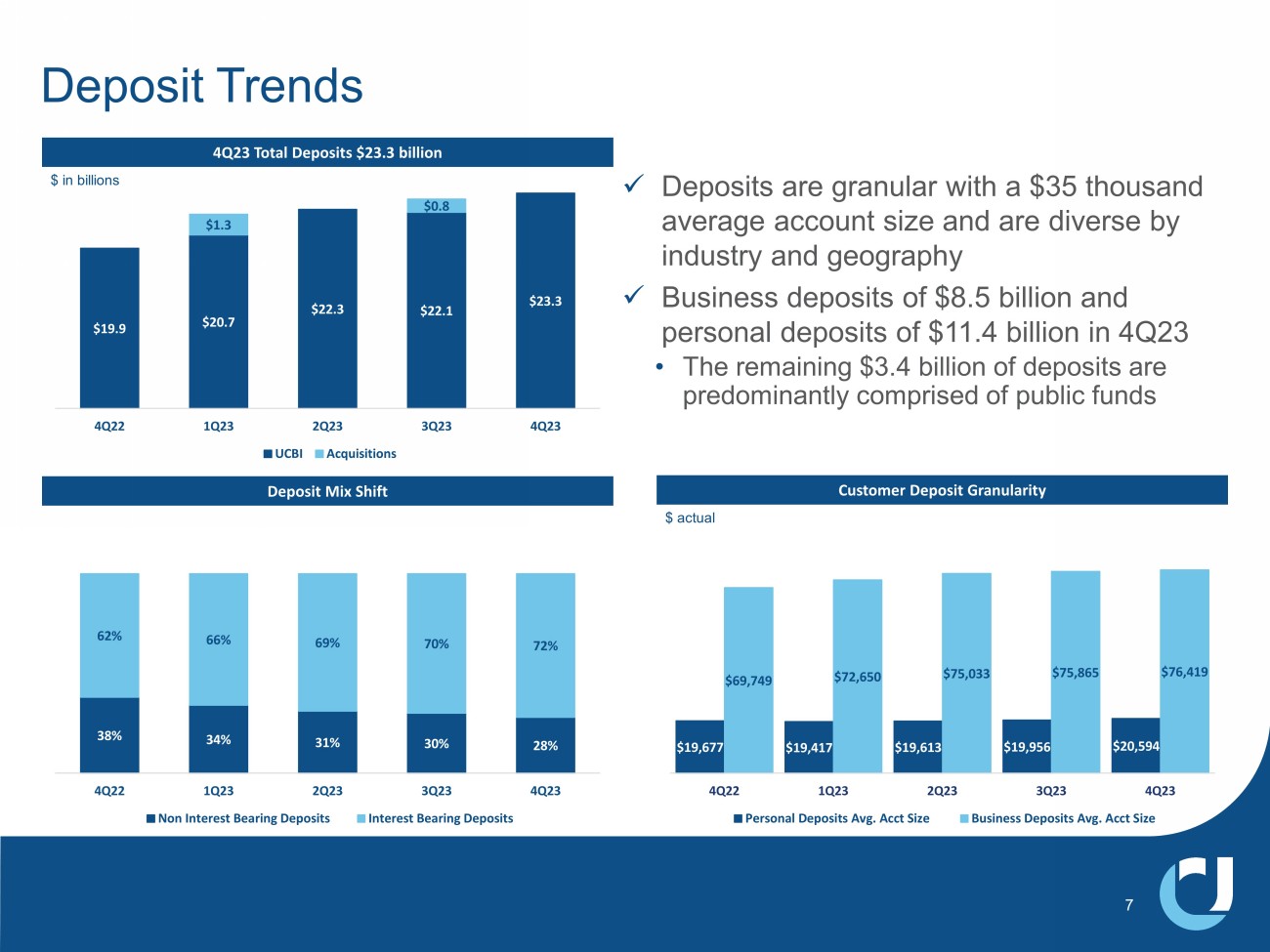 Strong Customer Deposit Growth x Total deposits were up $453 million in 4Q23 from 3Q23, driven by seasonal increases in public funds and the addition of new public funds accounts x Excluding Progress and FNBSM, total deposits were up $1.4 billion YOY, or 8.4% x Excluding brokered deposits (paid down $52 million), total deposits were up $504 million, or 8.9% annualized from 3Q23 Competitive Market Pricing Drove Funding Costs Higher x 42% cumulative deposit beta since 4Q21, as cost of deposits moved to 2.24% from 2.03% in 3Q23 x DDA% moved to 28% of total deposits from 30% last quarter, as customers moved funds to NOW and CDs 28% 27% 24% 5% 16% DDA MMDA Savings Time NOW Outstanding Deposit Franchise 4Q23 Total Deposits $23.3 billion Total Deposit Beta 12% 23% 32% 38% 42% 17% 23% 29% 34% 0.49% 1.10% 1.64% 2.03% 2.24% -0.22% 0.28% 0.78% 1.28% 1.78% 2.28% 0% 5% 10% 15% 20% 25% 30% 35% 40% 4Q22 1Q23 2Q23 3Q23 4Q23 UCBI Cumulative Deposit Beta KRX Peer Average Cumulative Deposit Beta UCBI Cost of Deposits 6