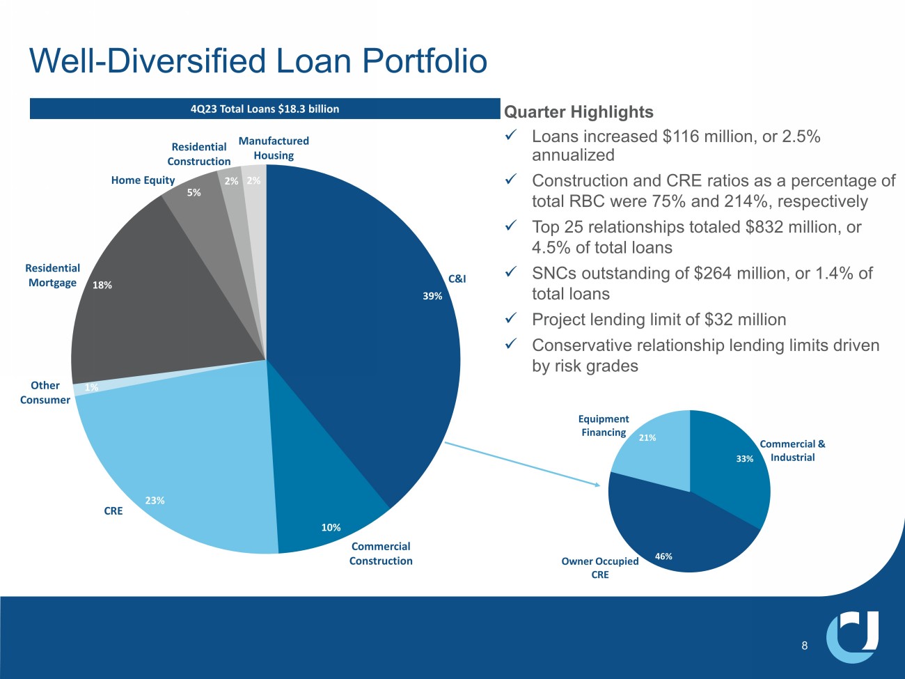 $19.9 $20.7 $22.3 $22.1 $23.3 $1.3 $0.8 4Q22 1Q23 2Q23 3Q23 4Q23 UCBI Acquisitions $ in billions Deposit Trends x Deposits are granular with a $35 thousand average account size and are diverse by industry and geography x Business deposits of $8.5 billion and personal deposits of $11.4 billion in 4Q23 • The remaining $3.4 billion of deposits are predominantly comprised of public funds 4Q23 Total Deposits $23.3 billion Deposit Mix Shift Customer Deposit Granularity $19,677 $19,417 $19,613 $19,956 $20,594 $69,749 $72,650 $75,033 $75,865 $76,419 4Q22 1Q23 2Q23 3Q23 4Q23 Personal Deposits Avg. Acct Size Business Deposits Avg. Acct Size 38% 34% 31% 30% 28% 62% 66% 69% 70% 72% 4Q22 1Q23 2Q23 3Q23 4Q23 Non Interest Bearing Deposits Interest Bearing Deposits 7 $ actual