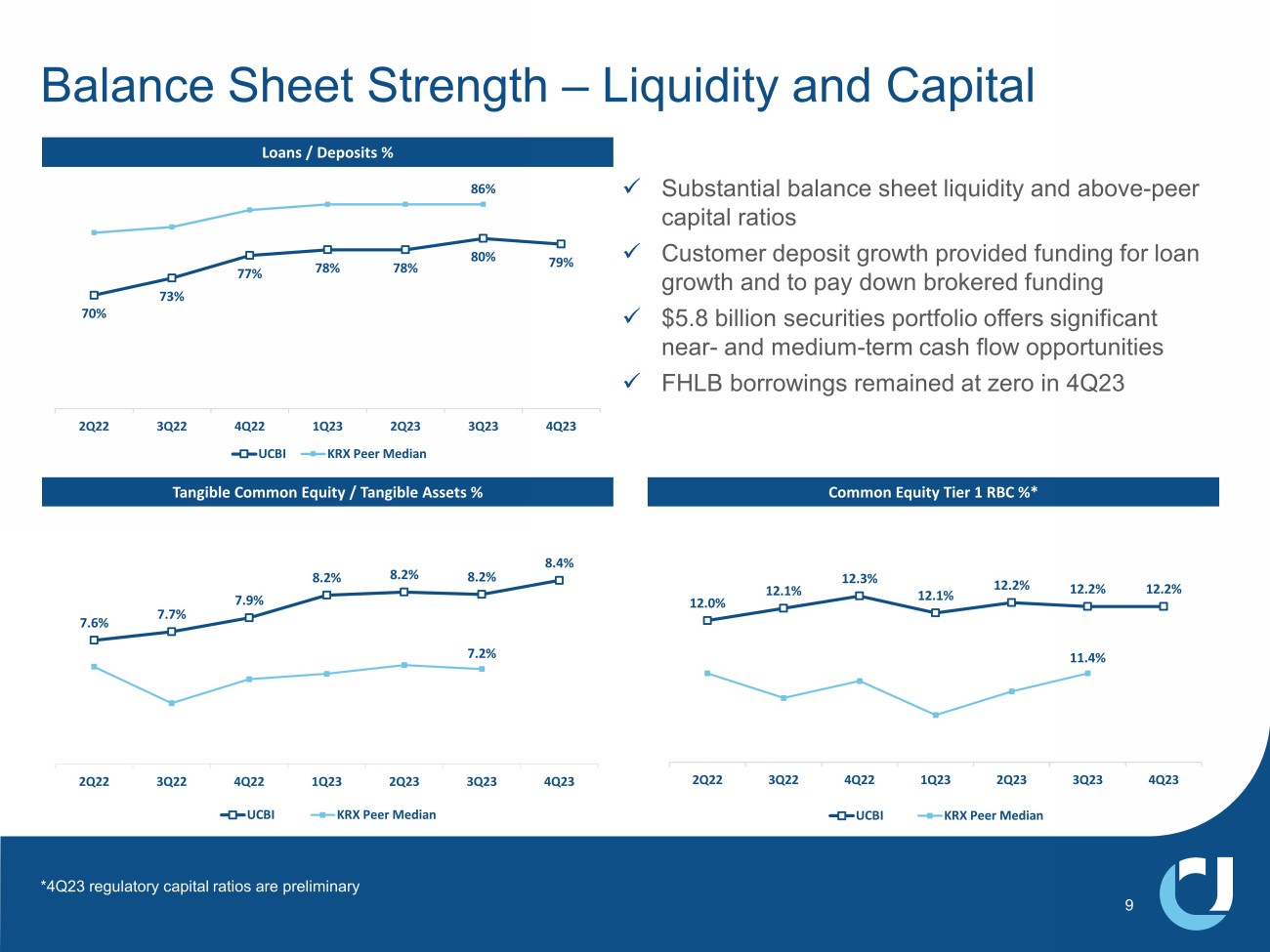 39% 10% 23% 1% 18% 5% 2% 2% Residential Mortgage Manufactured Housing 4Q23 Total Loans $18.3 billion Well - Diversified Loan Portfolio Quarter Highlights x Loans increased $116 million, or 2.5% annualized x Construction and CRE ratios as a percentage of total RBC were 75% and 214%, respectively x Top 25 relationships totaled $832 million, or 4.5% of total loans x SNCs outstanding of $264 million, or 1.4% of total loans x Project lending limit of $32 million x Conservative relationship lending limits driven by risk grades C&I Commercial Construction CRE Other Consumer Home Equity Residential Construction 33% 46% 21% Commercial & Industrial Owner Occupied CRE Equipment Financing 8