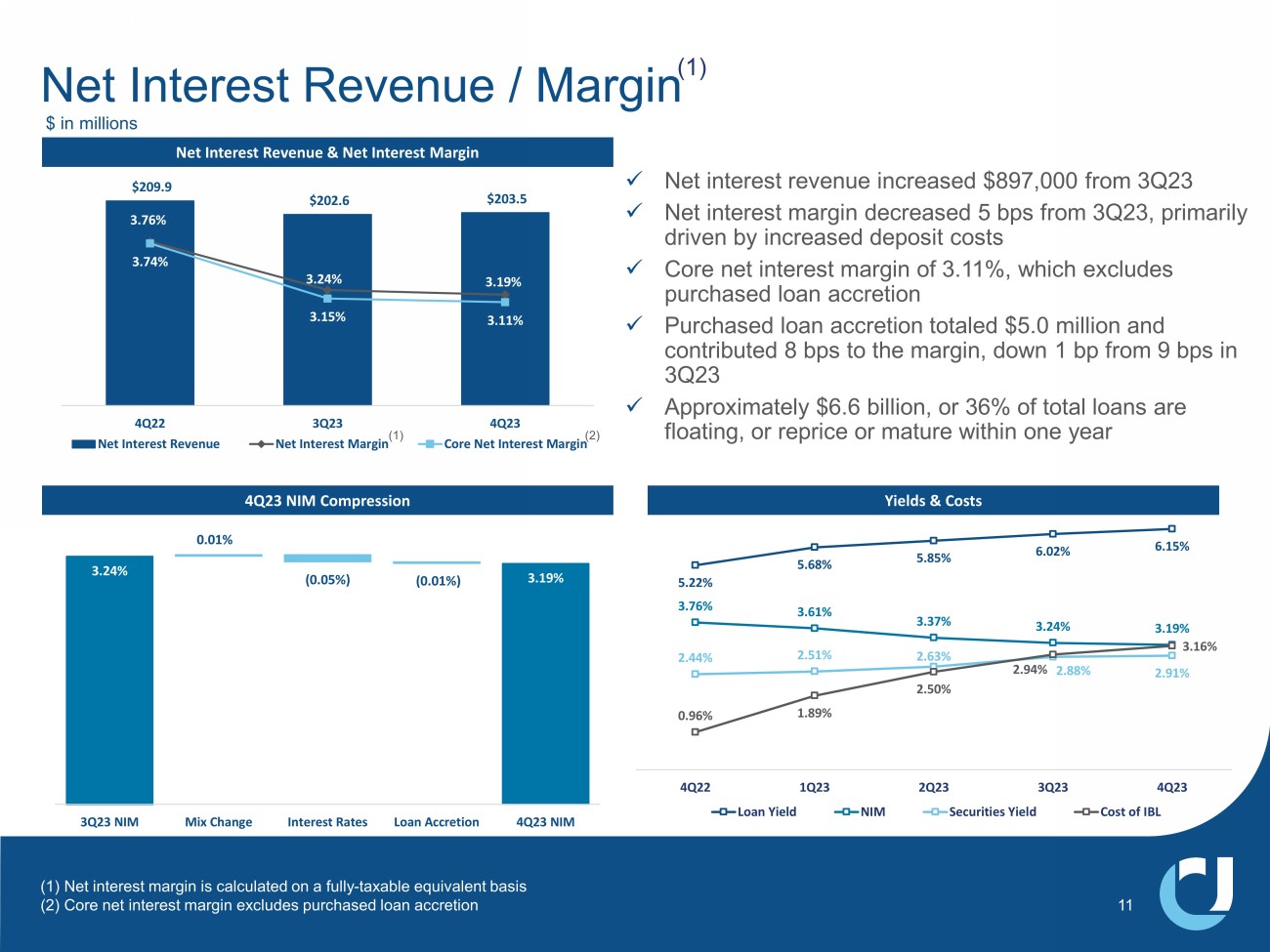 $209.9 $202.6 $203.5 3.76% 3.24% 3.19% 3.74% 3.15% 3.11% $100.0 $120.0 $140.0 $160.0 $180.0 $200.0 2.00% 2.50% 3.00% 3.50% 4.00% 4Q22 3Q23 4Q23 Net Interest Revenue Net Interest Margin Core Net Interest Margin 3.19% 3.24% 0.01% ( 0.05% ) ( 0.01% ) 3Q23 NIM Mix Change Interest Rates Loan Accretion 4Q23 NIM Net Interest Revenue & Net Interest Margin 4Q23 NIM Compression x Net interest revenue increased $897,000 from 3Q23 x Net interest margin decreased 5 bps from 3Q23, primarily driven by increased deposit costs x Core net interest margin of 3.11%, which excludes purchased loan accretion x Purchased loan accretion totaled $5.0 million and contributed 8 bps to the margin, down 1 bp from 9 bps in 3Q23 x Approximately $6.6 billion, or 36% of total loans are floating, or reprice or mature within one year Net Interest Revenue / Margin (1) Yields & Costs $ in millions 5.22% 5.68% 5.85% 6.02% 6.15% 3.76% 3.61% 3.37% 3.24% 3.19% 2.44% 2.51% 2.63% 2.88% 2.91% 0.96% 1.89% 2.50% 2.94% 3.16% 4Q22 1Q23 2Q23 3Q23 4Q23 Loan Yield NIM Securities Yield Cost of IBL (1) Net interest margin is calculated on a fully - taxable equivalent basis (2) Core net interest margin excludes purchased loan accretion (2) (1) 11