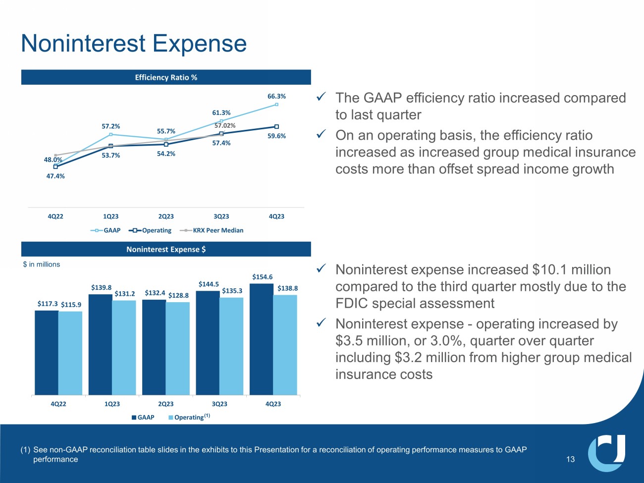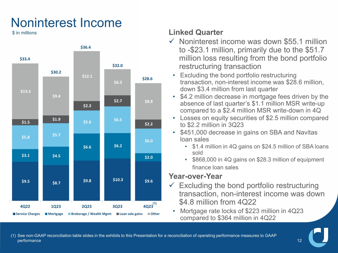 $9.5 $8.7 $9.8 $10.3 $9.6 $3.1 $4.5 $6.6 $6.2 $2.0 $5.8 $5.7 $5.6 $6.5 $6.0 $1.5 $1.9 $2.3 $2.7 $2.2 $13.5 $9.4 $12.1 $6.3 $8.8 4Q22 1Q23 2Q23 3Q23 4Q23 Service Charges Mortgage Brokerage / Wealth Mgmt Loan sale gains Other $36.4 $32.0 Linked Quarter x Noninterest income was down $55.1 million to - $23.1 million, primarily due to the $51.7 million loss resulting from the bond portfolio restructuring transaction • Excluding the bond portfolio restructuring transaction, non - interest income was $28.6 million, down $3.4 million from last quarter • $4.2 million decrease in mortgage fees driven by the absence of last quarter’s $1.1 million MSR write - up compared to a $2.4 million MSR write - down in 4Q • Losses on equity securities of $2.5 million compared to $2.2 million in 3Q23 • $451,000 decrease in gains on SBA and Navitas loan sales • $1.4 million in 4Q gains on $24.5 million of SBA loans sold • $868,000 in 4Q gains on $28.3 million of equipment finance loan sales Year - over - Year x Excluding the bond portfolio restructuring transaction, non - interest income was down $4.8 million from 4Q22 • Mortgage rate locks of $223 million in 4Q23 compared to $364 million in 4Q22 $30.2 $33.4 12 Noninterest Income $ in millions $28.6 (1) See non - GAAP reconciliation table slides in the exhibits to this Presentation for a reconciliation of operating performance meas ures to GAAP performance (1)