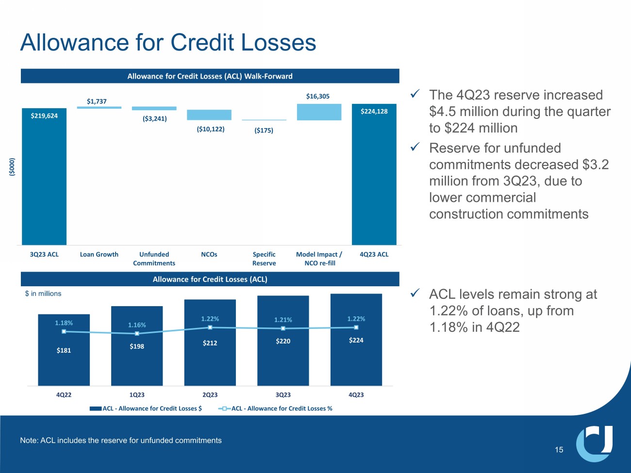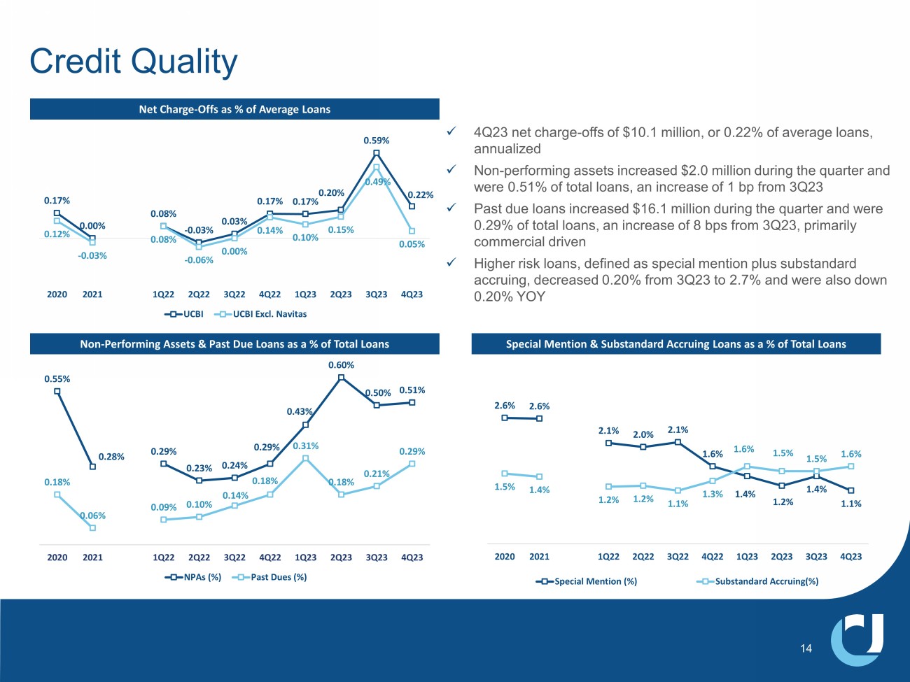 x 4Q23 net charge - offs of $10.1 million, or 0.22% of average loans, annualized x Non - performing assets increased $2.0 million during the quarter and were 0.51% of total loans, an increase of 1 bp from 3Q23 x Past due loans increased $16.1 million during the quarter and were 0.29% of total loans, an increase of 8 bps from 3Q23, primarily commercial driven x Higher risk loans, defined as special mention plus substandard accruing, decreased 0.20% from 3Q23 to 2.7% and were also down 0.20% YOY Credit Quality Net Charge - Offs as % of Average Loans Non - Performing Assets & Past Due Loans as a % of Total Loans 0.55% 0.28% 0.29% 0.23% 0.24% 0.29% 0.43% 0.60% 0.50% 0.51% 0.18% 0.06% 0.09% 0.10% 0.14% 0.18% 0.31% 0.18% 0.21% 0.29% 2020 2021 1Q22 2Q22 3Q22 4Q22 1Q23 2Q23 3Q23 4Q23 NPAs (%) Past Dues (%) 2.6% 2.6% 2.1% 2.0% 2.1% 1.6% 1.4% 1.2% 1.4% 1.1% 1.5% 1.4% 1.2% 1.2% 1.1% 1.3% 1.6% 1.5% 1.5% 1.6% 2020 2021 1Q22 2Q22 3Q22 4Q22 1Q23 2Q23 3Q23 4Q23 Special Mention (%) Substandard Accruing(%) Special Mention & Substandard Accruing Loans as a % of Total Loans 14 0.17% 0.00% 0.08% - 0.03% 0.03% 0.17% 0.17% 0.20% 0.59% 0.22% 0.12% - 0.03% 0.08% - 0.06% 0.00% 0.14% 0.10% 0.15% 0.49% 0.05% 2020 2021 1Q22 2Q22 3Q22 4Q22 1Q23 2Q23 3Q23 4Q23 UCBI UCBI Excl. Navitas