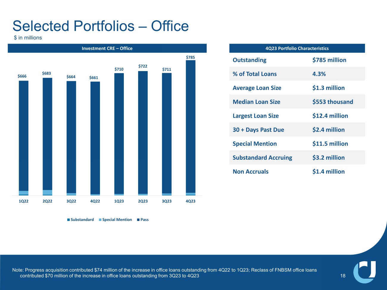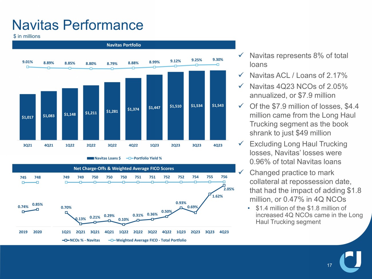 Navitas Portfolio Net Charge - Offs & Weighted Average FICO Scores x Navitas represents 8% of total loans x Navitas ACL / Loans of 2.17% x Navitas 4Q23 NCOs of 2.05% annualized, or $7.9 million x Of the $7.9 million of losses, $4.4 million came from the Long Haul Trucking segment as the book shrank to just $49 million x Excluding Long Haul Trucking losses, Navitas’ losses were 0.96% of total Navitas loans x Changed practice to mark collateral at repossession date, that had the impact of adding $1.8 million, or 0.47% in 4Q NCOs • $1.4 million of the $1.8 million of increased 4Q NCOs came in the Long Haul Trucking segment Navitas Performance $ in millions $1,017 $1,083 $1,148 $1,211 $1,281 $1,374 $1,447 $1,510 $1,534 $1,543 9.01% 8.89% 8.85% 8.80% 8.79% 8.88% 8.99% 9.12% 9.25% 9.30% 0.00% 1.00% 2.00% 3.00% 4.00% 5.00% 6.00% 7.00% 8.00% 9.00% 10.00% $0 $200 $400 $600 $800 $1,000 $1,200 $1,400 $1,600 $1,800 3Q21 4Q21 1Q22 2Q22 3Q22 4Q22 1Q23 2Q23 3Q23 4Q23 Navitas Loans $ Portfolio Yield % 17 0.74% 0.85% 0.70% 0.13% 0.21% 0.29% 0.10% 0.31% 0.36% 0.50% 0.93% 0.69% 1.62% 2.05% 745 748 749 749 750 750 750 751 751 752 752 754 755 756 1 101 201 301 401 501 601 701 801 0.00% 0.50% 1.00% 1.50% 2.00% 2.50% 2019 2020 1Q21 2Q21 3Q21 4Q21 1Q22 2Q22 3Q22 4Q22 1Q23 2Q23 3Q23 4Q23 NCOs % - Navitas Weighted Average FICO - Total Portfolio