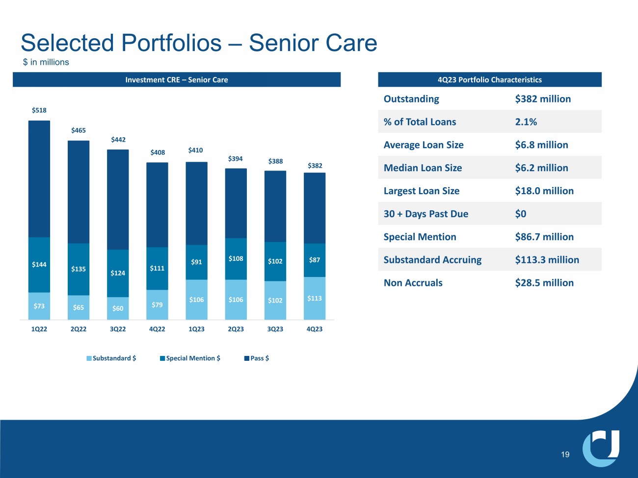 1% 20% 25% 49% 6% Selected Portfolios – Office $ in millions Note: Progress acquisition contributed $74 million of the increase in office loans outstanding from 4Q22 to 1Q23; Reclass of FNB SM office loans contributed $70 million of the increase in office loans outstanding from 3Q23 to 4Q23 18 Outstanding $785 million % of Total Loans 4.3% Average Loan Size $1.3 million Median Loan Size $553 thousand Largest Loan Size $12.4 million 30 + Days Past Due $2.4 million Special Mention $11.5 million Substandard Accruing $3.2 million Non Accruals $1.4 million 4Q23 Portfolio Characteristics Investment CRE – Office $666 $683 $664 $661 $710 $722 $711 $785 1Q22 2Q22 3Q22 4Q22 1Q23 2Q23 3Q23 4Q23 Substandard Special Mention Pass