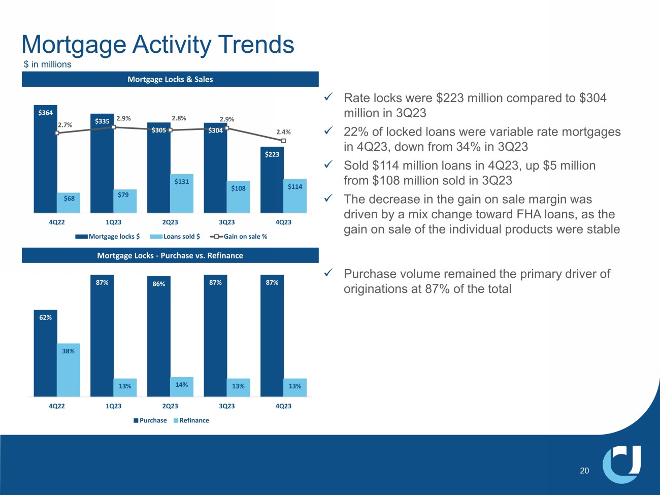 x Rate locks were $223 million compared to $304 million in 3Q23 x 22% of locked loans were variable rate mortgages in 4Q23, down from 34% in 3Q23 x Sold $114 million loans in 4Q23, up $5 million from $108 million sold in 3Q23 x The decrease in the gain on sale margin was driven by a mix change toward FHA loans, as the gain on sale of the individual products were stable Mortgage Locks & Sales Mortgage Locks - Purchase vs. Refinance Mortgage Activity Trends $364 $335 $305 $304 $223 $68 $79 $131 $108 $114 2.7% 2.9% 2.8% 2.9% 2.4% 0.00% 0.50% 1.00% 1.50% 2.00% 2.50% 3.00% 3.50% 4.00% $0 $50 $100 $150 $200 $250 $300 $350 $400 4Q22 1Q23 2Q23 3Q23 4Q23 Mortgage locks $ Loans sold $ Gain on sale % 62% 87% 86% 87% 87% 38% 13% 14% 13% 13% 4Q22 1Q23 2Q23 3Q23 4Q23 Purchase Refinance $ in millions 20 x Purchase volume remained the primary driver of originations at 87% of the total