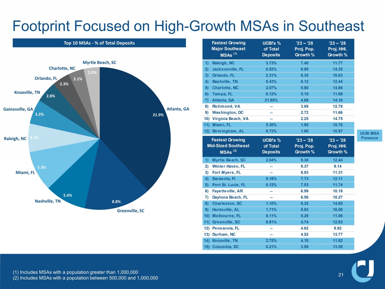 (1) Includes MSAs with a population greater than 1,000,000 (2) Includes MSAs with a population between 500,000 and 1,000,000 Footprint Focused on High - Growth MSAs in Southeast 21 21.9% 8.8% 5.4% 5.3% 3.7% 3.2% 2.8% 2.3% 2.1% 2.0% Atlanta, GA Greenville, SC Nashville, TN Miami, FL Raleigh, NC Gainesville, GA Knoxville, TN Orlando, FL Charlotte, NC Myrtle Beach, SC Top 10 MSAs - % of Total Deposits UCBI's % of Total Deposits ’23 – ’28 Proj. Pop. Growth % ’23 – ’28 Proj. HHI. Growth % 1) Raleigh, NC 3.73% 7.40 11.77 2) Jacksonville, FL 0.52% 6.89 14.35 3) Orlando, FL 2.31% 6.35 10.63 4) Nashville, TN 5.43% 6.12 12.44 5) Charlotte, NC 2.07% 5.80 14.66 6) Tampa, FL 0.12% 5.19 11.68 7) Atlanta, GA 21.85% 4.68 14.16 8) Richmond, VA -- 3.88 12.78 9) Washington, DC -- 2.72 11.66 10) Virginia Beach, VA -- 2.25 14.75 11) Miami, FL 5.30% 1.95 10.76 12) Birmingham, AL 0.73% 1.60 10.87 Fastest Growing Major Southeast MSAs (1) UCBI's % of Total Deposits ’23 – ’28 Proj. Pop. Growth % ’23 – ’28 Proj. HHI. Growth % 1) Myrtle Beach, SC 2.04% 9.38 12.44 2) Winter Haven, FL -- 9.37 9.14 3) Fort Myers, FL -- 8.93 11.31 4) Sarasota, Fl 0.18% 7.73 12.11 5) Port St. Lucie, FL 0.12% 7.53 11.74 6) Fayetteville, AR -- 6.99 10.18 7) Daytona Beach, FL -- 6.56 10.27 8) Charleston, SC 1.10% 6.32 14.65 9) Huntsville, AL 1.71% 5.93 16.50 10) Melbourne, FL 0.11% 5.29 11.06 11) Greenville, SC 8.81% 4.74 12.63 12) Pensacola, FL -- 4.62 9.92 13) Durham, NC -- 4.52 13.77 14) Knoxville, TN 2.75% 4.10 11.62 15) Columbia, SC 0.21% 3.59 13.59 Fastest Growing Mid-Sized Southeast MSAs (2) UCBI MSA Presence