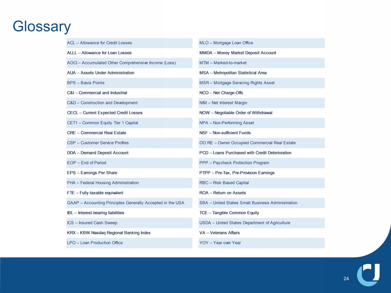 Glossary ACL – Allowance for Credit Losses MLO – Mortgage Loan Office ALLL – Allowance for Loan Losses MMDA – Money Market Deposit Account AOCI – Accumulated Other Comprehensive Income (Loss) MTM – Marked-to-market AUA – Assets Under Administration MSA – Metropolitan Statistical Area BPS – Basis Points MSR – Mortgage Servicing Rights Asset C&I – Commercial and Industrial NCO – Net Charge-Offs C&D – Construction and Development NIM – Net Interest Margin CECL – Current Expected Credit Losses NOW – Negotiable Order of Withdrawal CET1 – Common Equity Tier 1 Capital NPA – Non-Performing Asset CRE – Commercial Real Estate NSF – Non-sufficient Funds CSP – Customer Service Profiles OO RE – Owner Occupied Commercial Real Estate DDA – Demand Deposit Account PCD – Loans Purchased with Credit Deterioration EOP – End of Period PPP – Paycheck Protection Program EPS – Earnings Per Share PTPP – Pre-Tax, Pre-Provision Earnings FHA – Federal Housing Administration RBC – Risk Based Capital FTE – Fully-taxable equivalent ROA – Return on Assets GAAP – Accounting Principles Generally Accepted in the USA SBA – United States Small Business Administration IBL – Interest-bearing liabilities TCE – Tangible Common Equity ICS – Insured Cash Sweep USDA – United States Department of Agriculture KRX – KBW Nasdaq Regional Banking Index VA – Veterans Affairs LPO – Loan Production Office YOY – Year over Year 24