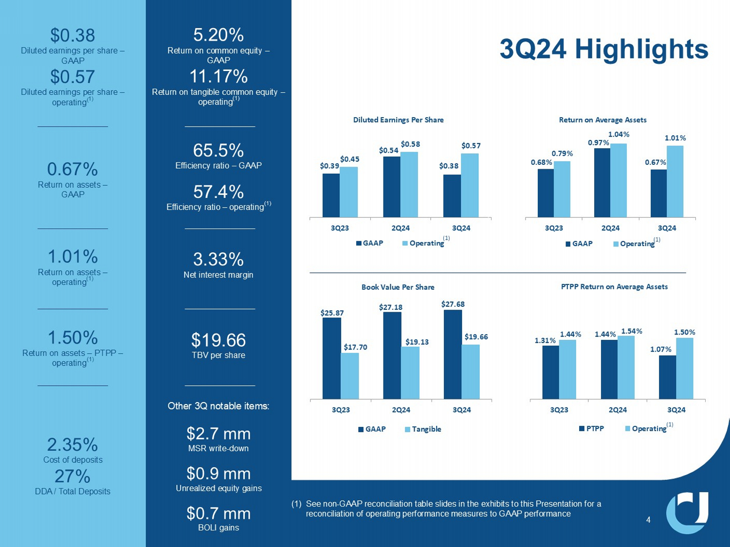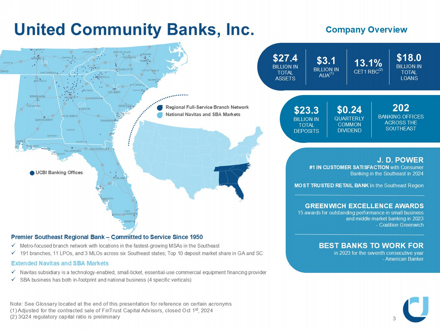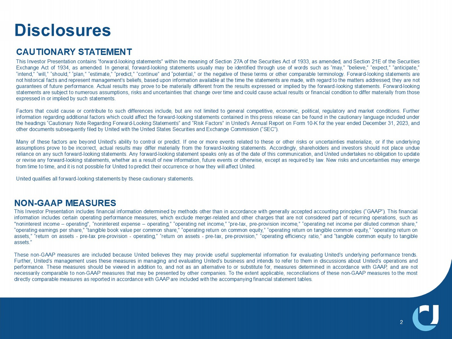 Disclosures 2 CAUTIONARY STATEMENT This Investor Presentation contains “forward - looking statements” within the meaning of Section 27 A of the Securities Act of 1933 , as amended, and Section 21 E of the Securities Exchange Act of 1934 , as amended . In general, forward - looking statements usually may be identified through use of words such as “may,” “believe,” “expect,” “anticipate,” “intend,” “will,” “should,” “plan,” “estimate,” “predict,” “continue” and “potential,” or the negative of these terms or other comparable terminology . Forward - looking statements are not historical facts and represent management’s beliefs, based upon information available at the time the statements are made, with regard to the matters addressed; they are not guarantees of future performance . Actual results may prove to be materially different from the results expressed or implied by the forward - looking statements . Forward - looking statements are subject to numerous assumptions, risks and uncertainties that change over time and could cause actual results or financial condition to differ materially from those expressed in or implied by such statements . Factors that could cause or contribute to such differences include, but are not limited to general competitive, economic, political, regulatory and market conditions . Further information regarding additional factors which could affect the forward - looking statements contained in this press release can be found in the cautionary language included under the headings “Cautionary Note Regarding Forward - Looking Statements” and “Risk Factors” in United’s Annual Report on Form 10 - K for the year ended December 31 , 2023 , and other documents subsequently filed by United with the United States Securities and Exchange Commission (“SEC”) . Many of these factors are beyond United’s ability to control or predict . If one or more events related to these or other risks or uncertainties materialize, or if the underlying assumptions prove to be incorrect, actual results may differ materially from the forward - looking statements . Accordingly, shareholders and investors should not place undue reliance on any such forward - looking statements . Any forward - looking statement speaks only as of the date of this communication, and United undertakes no obligation to update or revise any forward - looking statements, whether as a result of new information, future events or otherwise, except as required by law . New risks and uncertainties may emerge from time to time, and it is not possible for United to predict their occurrence or how they will affect United . United qualifies all forward - looking statements by these cautionary statements . NON - GAAP MEASURES This Investor Presentation includes financial information determined by methods other than in accordance with generally accepted accounting principles (“GAAP”) . This financial information includes certain operating performance measures, which exclude merger - related and other charges that are not considered part of recurring operations, such as "noninterest income – operating", “ noninterest expense – operating,” “operating net income,” “pre - tax, pre - provision income,” “operating net income per diluted common share,” “operating earnings per share,” “tangible book value per common share,” “operating return on common equity,” “operating return on tangible common equity,” “operating return on assets,” “return on assets - pre - tax pre - provision - operating,” “return on assets - pre - tax, pre - provision,” “operating efficiency ratio,” and “tangible common equity to tangible assets . ” These non - GAAP measures are included because United believes they may provide useful supplemental information for evaluating United’s underlying performance trends . Further, United’s management uses these measures in managing and evaluating United’s business and intends to refer to them in discussions about United’s operations and performance . These measures should be viewed in addition to, and not as an alternative to or substitute for, measures determined in accordance with GAAP, and are not necessarily comparable to non - GAAP measures that may be presented by other companies . To the extent applicable, reconciliations of these non - GAAP measures to the most directly comparable measures as reported in accordance with GAAP are included with the accompanying financial statement tables . JP0