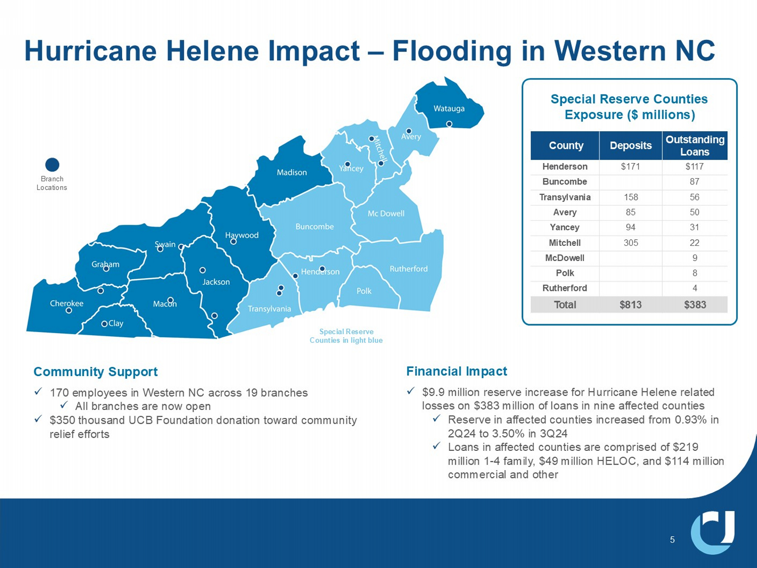 3.33% Net interest margin $0.39 $0.54 $0.38 $0.45 $0.58 $0.57 3Q23 2Q24 3Q24 Diluted Earnings Per Share GAAP Operating $19.66 TBV per share $25.87 $27.18 $27.68 $17.70 $19.13 $19.66 3Q23 2Q24 3Q24 Book Value Per Share GAAP Tangible 5.20% Return on common equity – GAAP 11.17% Return on tangible common equity – operating (1) Other 3Q notable items: $2.7 mm MSR write - down $0.9 mm Unrealized equity gains $0.7 mm BOLI gains 1.01% Return on assets – operating (1) 1.50% Return on assets – PTPP – operating (1) 2.35% Cost of deposits 27% DDA / Total Deposits $0.38 Diluted earnings per share – GAAP $0.57 Diluted earnings per share – operating ( 1) 0.67% Return on assets – GAAP 3Q24 Highlights (1) See non - GAAP reconciliation table slides in the exhibits to this Presentation for a reconciliation of operating performance measures to GAAP performance 0.68% 0.97% 0.67% 0.79% 1.04% 1.01% 3Q23 2Q24 3Q24 Return on Average Assets GAAP Operating 1.31% 1.44% 1.07% 1.44% 1.54% 1.50% 3Q23 2Q24 3Q24 PTPP Return on Average Assets PTPP Operating 4 65.5% Efficiency ratio – GAAP 57.4% Efficiency ratio – operating (1) (1) (1) (1)JH0JH1JH2 EB3 EB4 EB5