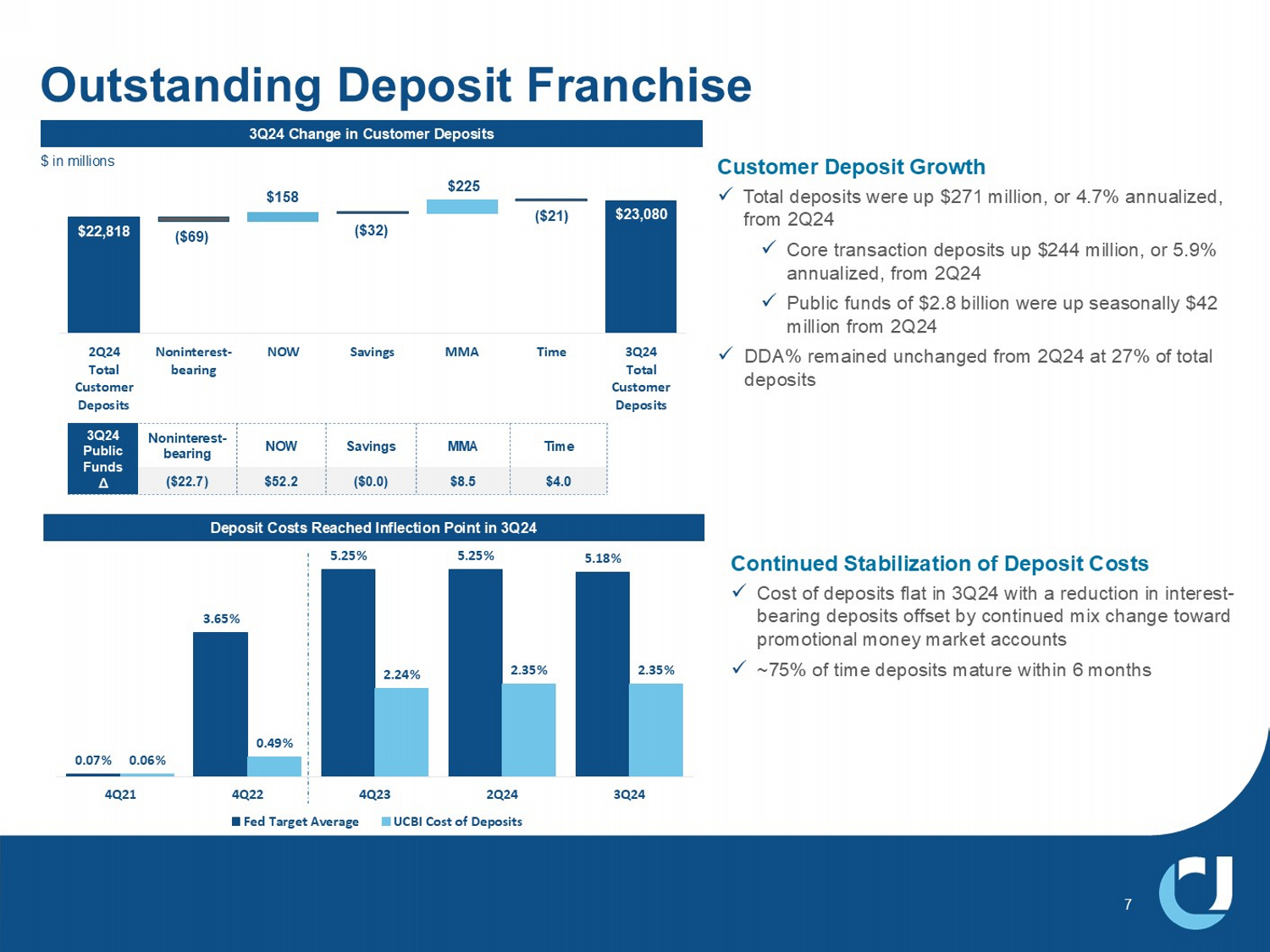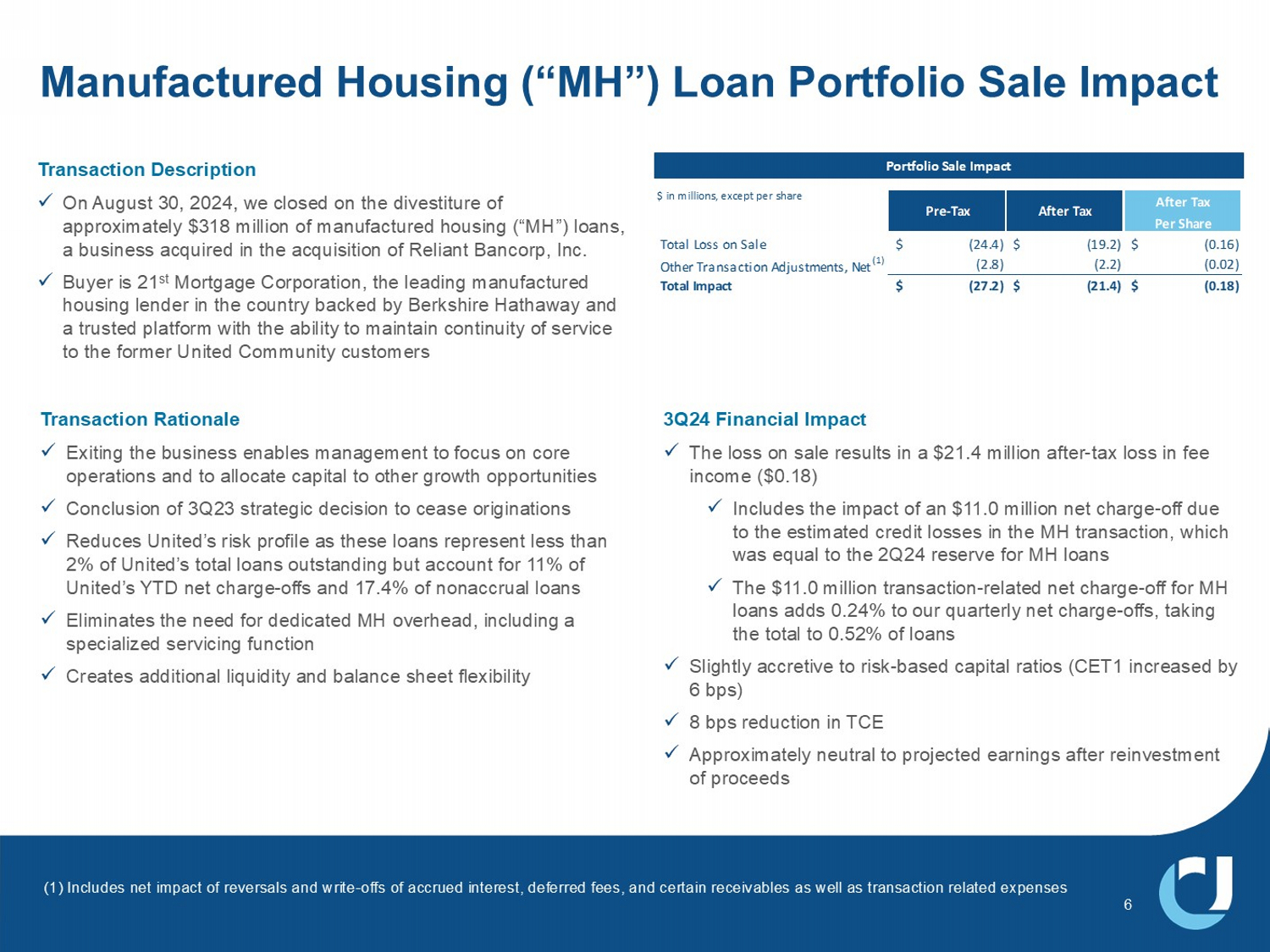 Manufactured Housing (“MH”) Loan Portfolio Sale Impact 6 3Q24 Financial Impact x The loss on sale results in a $21.4 million after - tax loss in fee income ($0.18) x Includes the impact of an $11.0 million net charge - off due to the estimated credit losses in the MH transaction, which was equal to the 2Q24 reserve for MH loans x The $11.0 million transaction - related net charge - off for MH loans adds 0.24% to our quarterly net charge - offs, taking the total to 0.52% of loans x Slightly accretive to risk - based capital ratios (CET1 increased by 6 bps) x 8 bps reduction in TCE x Approximately neutral to projected earnings after reinvestment of proceeds Transaction Rationale x Exiting the business enables management to focus on core operations and to allocate capital to other growth opportunities x Conclusion of 3Q23 strategic decision to cease originations x Reduces United’s risk profile as these loans represent less than 2% of United’s total loans outstanding but account for 11% of United’s YTD net charge - offs and 17.4% of nonaccrual loans x Eliminates the need for dedicated MH overhead, including a specialized servicing function x Creates additional liquidity and balance sheet flexibility Portfolio Sale Impact $ in millions, except per share Transaction Description x On August 30, 2024, we closed on the divestiture of approximately $318 million of manufactured housing (“MH”) loans, a business acquired in the acquisition of Reliant Bancorp, Inc. x Buyer is 21 st Mortgage Corporation, the leading manufactured housing lender in the country backed by Berkshire Hathaway and a trusted platform with the ability to maintain continuity of service to the former United Community customers (1) Includes net impact of reversals and write - offs of accrued interest, deferred fees, and certain receivables as well as trans action related expenses After Tax Per Share Total Loss on Sale (24.4)$ (19.2)$ (0.16)$ Other Transaction Adjustments, Net (1) (2.8) (2.2) (0.02) Total Impact (27.2)$ (21.4)$ (0.18)$ Pre-Tax After Tax JH0 EB1 EB2