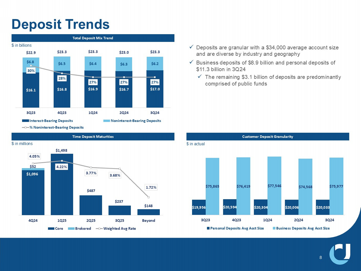 0.07% 3.65% 5.25% 5.25% 5.18% 0.06% 0.49% 2.24% 2.35% 2.35% 4Q21 4Q22 4Q23 2Q24 3Q24 Fed Target Average UCBI Cost of Deposits Outstanding Deposit Franchise Deposit Costs Reached Inflection Point in 3Q24 7 Customer Deposit Growth x Total deposits were up $271 million, or 4.7% annualized, from 2Q24 x Core transaction deposits up $244 million, or 5.9% annualized, from 2Q24 x Public funds of $2.8 billion were up seasonally $42 million from 2Q24 x DDA% remained unchanged from 2Q24 at 27% of total deposits 3Q24 Change in Customer Deposits $23,080 $22,818 2Q24 Total Customer Deposits Noninterest- bearing NOW Savings MMA Time 3Q24 Total Customer Deposits ($69) $158 ($32) $225 ($21) $ in millions Continued Stabilization of Deposit Costs x Cost of deposits flat in 3Q24 with a reduction in interest - bearing deposits offset by continued mix change toward promotional money market accounts x ~75% of time deposits mature within 6 months Time MMA Savings NOW Noninterest - bearing 3Q24 Public Funds Δ $4.0 $8.5 ($0.0) $52.2 ($22.7) KB0 EB1 EB2 EB3