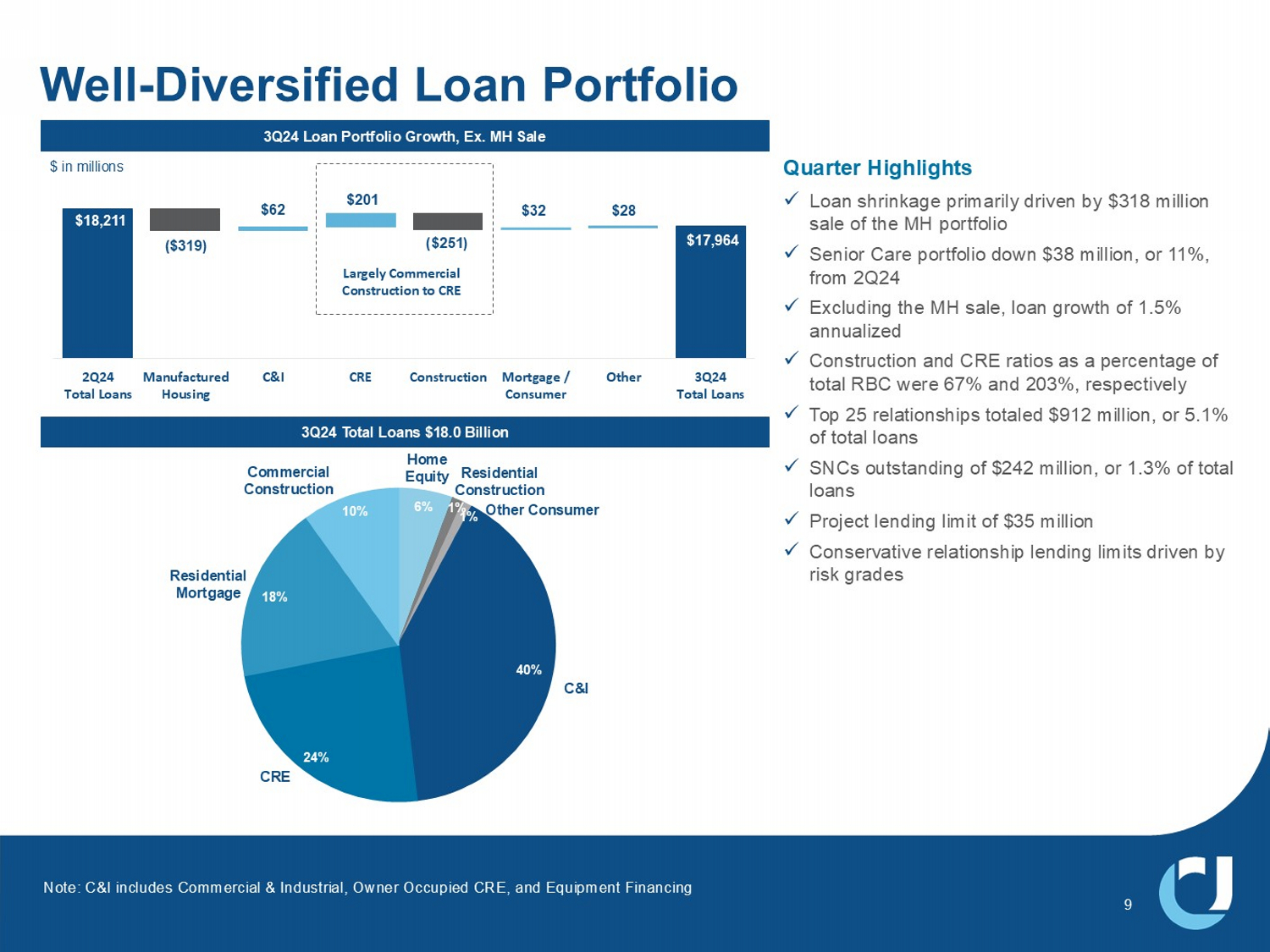 Deposit Trends x Deposits are granular with a $34,000 average account size and are diverse by industry and geography x Business deposits of $8.9 billion and personal deposits of $11.3 billion in 3Q24 x The remaining $3.1 billion of deposits are predominantly comprised of public funds Time Deposit Maturities Customer Deposit Granularity $19,956 $20,594 $20,304 $20,006 $20,033 $75,865 $76,419 $77,546 $74,568 $75,977 3Q23 4Q23 1Q24 2Q24 3Q24 Personal Deposits Avg Acct Size Business Deposits Avg Acct Size $16.1 $16.8 $16.9 $16.7 $17.0 $6.8 $6.5 $6.4 $6.3 $6.2 $22.9 $23.3 $23.3 $23.0 $23.3 30% 28% 27% 27% 27% 3Q23 4Q23 1Q24 2Q24 3Q24 Interest-Bearing Deposits Noninterest-Bearing Deposits % Noninterest-Bearing Deposits 8 Total Deposit Mix Trend $ in billions $ in actual $ in millions $1,096 $1,498 $487 $237 $148 $52 - - - - 4.05% 4.22% 3.77% 3.68% 1.72% - 200 400 600 800 1,000 1,200 1,400 1,600 0.50% 1.00% 1.50% 2.00% 2.50% 3.00% 3.50% 4.00% 4.50% 5.00% 4Q24 1Q25 2Q25 3Q25 Beyond Core Brokered Weighted Avg Rate EB0