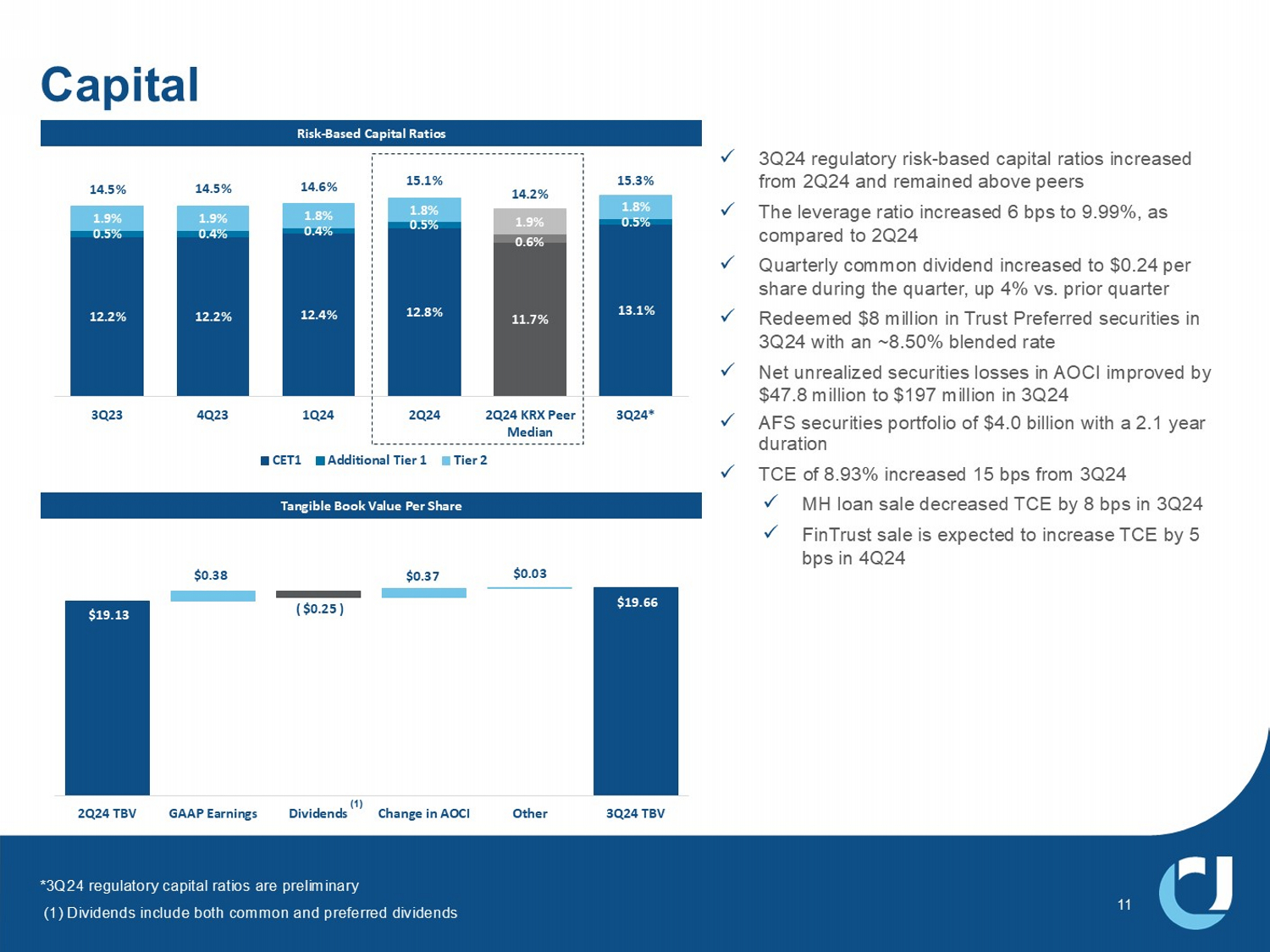80% 79% 79% 80% 78% 97% 3Q23 4Q23 1Q24 2Q24 3Q24 United KRX Peer Median x Substantial balance sheet liquidity and above - peer capital ratios x $6.4 billion securities portfolio offers significant near - and medium - term cash flow opportunities x FHLB borrowings remained at zero in 3Q24 x 0.7% of total deposits are brokered in 3Q24, compared to 3.4% for the KRX peer median 8.2% 8.4% 8.5% 8.8% 8.9% 7.8% 3Q23 4Q23 1Q24 2Q24 3Q24 United KRX Peer Median Loans / Core Deposits % Tangible Common Equity / Tangible Assets % Common Equity Tier 1 RBC %* 12.2% 12.2% 12.4% 12.8% 13.1% 11.7% 3Q23 4Q23 1Q24 2Q24 3Q24 United KRX Peer Median Balance Sheet Strength – Liquidity and Capital 10 *3Q24 regulatory capital ratio is preliminary EB0 KB1