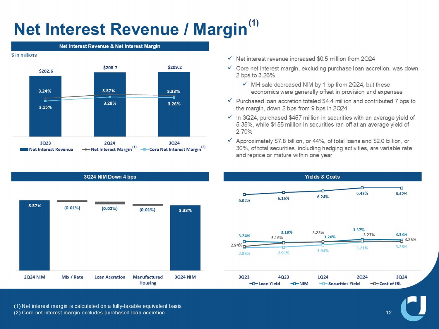 Risk - Based Capital Ratios Tangible Book Value Per Share x 3Q24 regulatory risk - based capital ratios increased from 2Q24 and remained above peers x The leverage ratio increased 6 bps to 9.99%, as compared to 2Q24 x Quarterly common dividend increased to $0.24 per share during the quarter, up 4% vs. prior quarter x Redeemed $8 million in Trust Preferred securities in 3Q24 with an ~8.50% blended rate x Net unrealized securities losses in AOCI improved by $47.8 million to $197 million in 3Q24 x AFS securities portfolio of $4.0 billion with a 2.1 year duration x TCE of 8.93% increased 15 bps from 3Q24 x MH loan sale decreased TCE by 8 bps in 3Q24 x FinTrust sale is expected to increase TCE by 5 bps in 4Q24 12.2% 12.2% 12.4% 12.8% 11.7% 13.1% 0.5% 0.4% 0.4% 0.5% 0.6% 0.5% 1.9% 1.9% 1.8% 1.8% 1.9% 1.8% 14.5% 14.5% 14.6% 15.1% 14.2% 15.3% 3Q23 4Q23 1Q24 2Q24 2Q24 KRX Peer Median 3Q24* CET1 Additional Tier 1 Tier 2 Capital $19.66 $19.13 $0.38 ( $0.25 ) $0.37 $0.03 2Q24 TBV GAAP Earnings Dividends Change in AOCI Other 3Q24 TBV 11 *3Q24 regulatory capital ratios are preliminary (1) Dividends include both common and preferred dividends (1)JH0JH1 EB2 JH3KB4