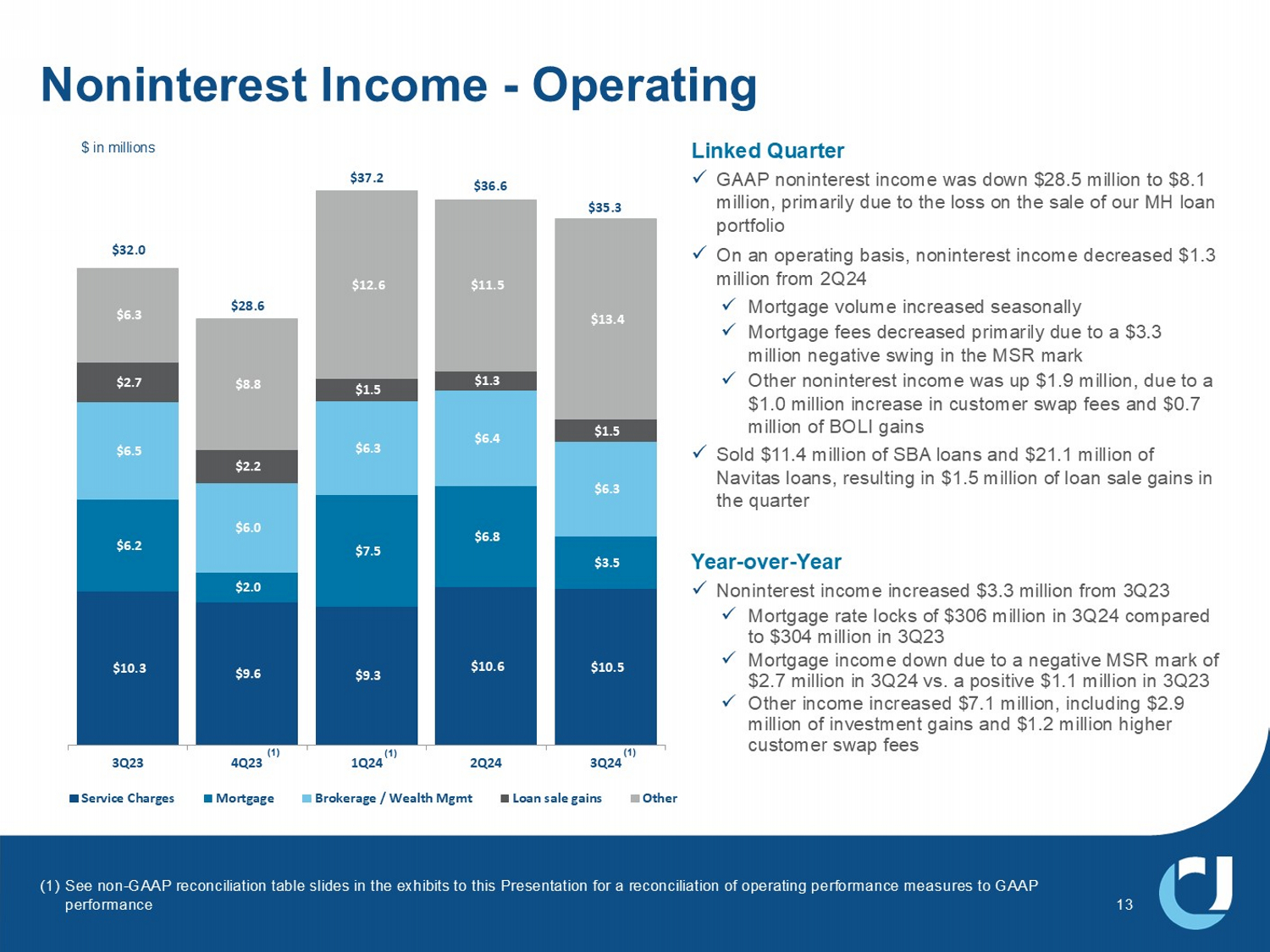 $202.6 $208.7 $209.2 3.24% 3.37% 3.33% 3.15% 3.28% 3.26% $100.0 $120.0 $140.0 $160.0 $180.0 $200.0 2.00% 2.50% 3.00% 3.50% 4.00% 3Q23 2Q24 3Q24 Net Interest Revenue Net Interest Margin Core Net Interest Margin 3.33% 3.37% 2Q24 NIM Mix / Rate Loan Accretion Manufactured Housing 3Q24 NIM Net Interest Revenue & Net Interest Margin 3Q24 NIM Down 4 bps x Net interest revenue increased $0.5 million from 2Q24 x Core net interest margin, excluding purchase loan accretion, was down 2 bps to 3.26% x MH sale decreased NIM by 1 bp from 2Q24, but these economics were generally offset in provision and expenses x Purchased loan accretion totaled $4.4 million and contributed 7 bps to the margin, down 2 bps from 9 bps in 2Q24 x In 3Q24, purchased $457 million in securities with an average yield of 5.35%, while $155 million in securities ran off at an average yield of 2.70% x Approximately $7.8 billion , or 44%, of total loans and $2.0 billion, or 30%, of total securities, including hedging activities, are variable rate and reprice or mature within one year Net Interest Revenue / Margin (1) Yields & Costs 6.02% 6.15% 6.24% 6.43% 6.42% 3.24% 3.19% 3.20% 3.37% 3.33% 2.88% 2.91% 3.04% 3.21% 3.28% 2.94% 3.16% 3.23% 3.27% 3.25% 3Q23 4Q23 1Q24 2Q24 3Q24 Loan Yield NIM Securities Yield Cost of IBL (1) Net interest margin is calculated on a fully - taxable equivalent basis (2) Core net interest margin excludes purchased loan accretion (2) (1) 12 $ in millions (0.01%) (0.02%) (0.01%) EB0 EB1 EB2 EB3