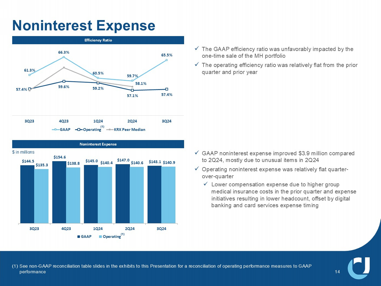 $10.3 $9.6 $9.3 $10.6 $10.5 $6.2 $2.0 $7.5 $6.8 $3.5 $6.5 $6.0 $6.3 $6.4 $6.3 $2.7 $2.2 $1.5 $1.3 $1.5 $6.3 $8.8 $12.6 $11.5 $13.4 3Q23 4Q23 1Q24 2Q24 3Q24 Service Charges Mortgage Brokerage / Wealth Mgmt Loan sale gains Other $37.2 $36.6 Linked Quarter x GAAP noninterest income was down $28.5 million to $8.1 million, primarily due to the loss on the sale of our MH loan portfolio x On an operating basis, noninterest income decreased $1.3 million from 2Q24 x Mortgage volume increased seasonally x Mortgage fees decreased primarily due to a $3.3 million negative swing in the MSR mark x Other noninterest income was up $1.9 million, due to a $1.0 million increase in customer swap fees and $0.7 million of BOLI gains x Sold $11.4 million of SBA loans and $21.1 million of Navitas loans, resulting in $1.5 million of loan sale gains in the quarter Year - over - Year x Noninterest income increased $3.3 million from 3Q23 x Mortgage rate locks of $306 million in 3Q24 compared to $304 million in 3Q23 x Mortgage income down due to a negative MSR mark of $2.7 million in 3Q24 vs. a positive $1.1 million in 3Q23 x Other income increased $7.1 million, including $2.9 million of investment gains and $1.2 million higher customer swap fees $28.6 $35.3 13 Noninterest Income - Operating (1) See non - GAAP reconciliation table slides in the exhibits to this Presentation for a reconciliation of operating performance meas ures to GAAP performance $32.0 $ in millions (1) (1) (1)JH0 CA1 EB2