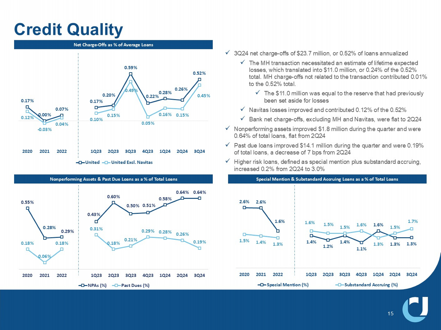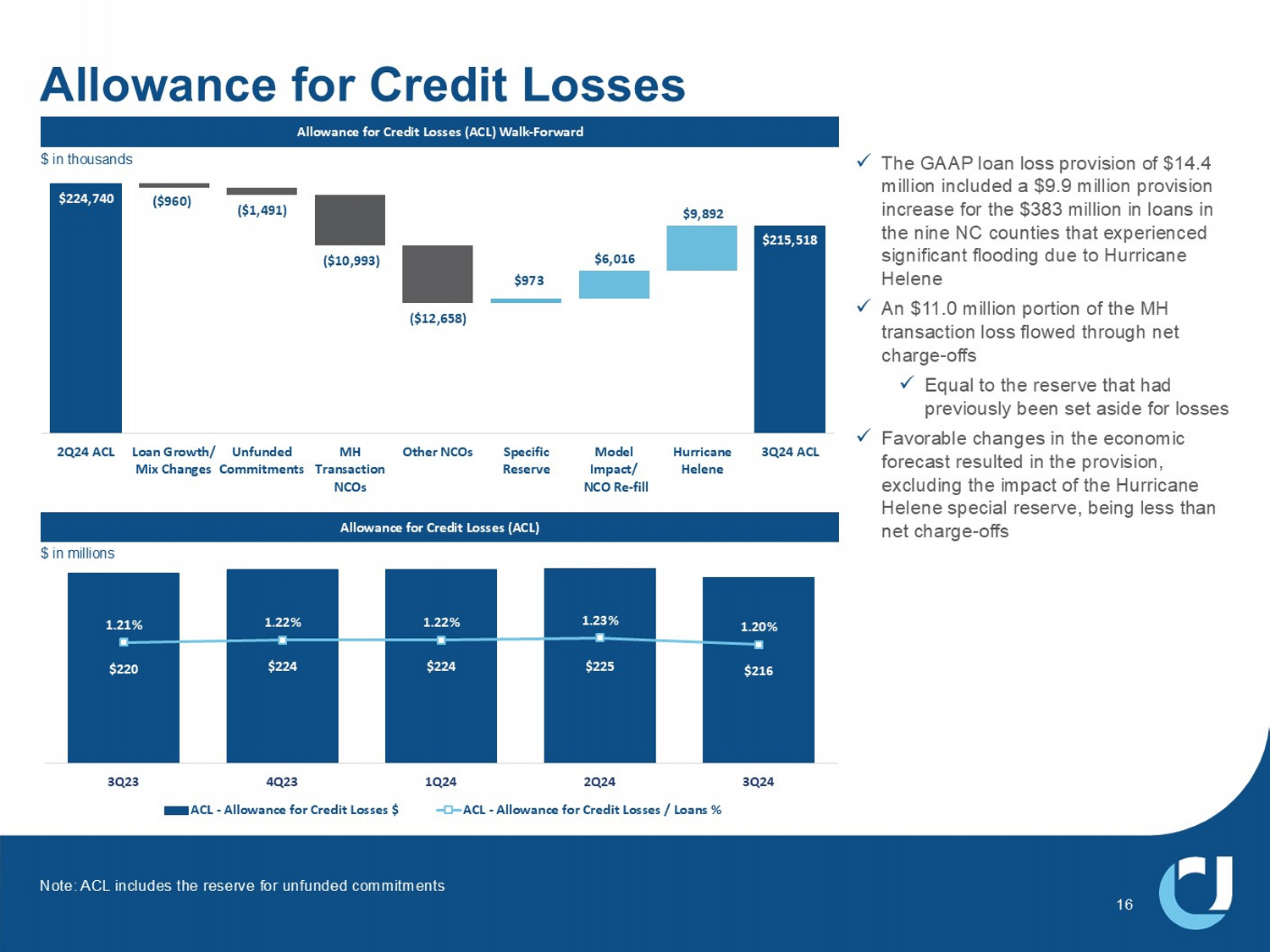 x 3Q24 net charge - offs of $23.7 million, or 0.52% of loans annualized x The MH transaction necessitated an estimate of lifetime expected losses, which translated into $11.0 million, or 0.24% of the 0.52% total. MH charge - offs not related to the transaction contributed 0.01% to the 0.52% total. x The $11.0 million was equal to the reserve that had previously been set aside for losses x Navitas losses improved and contributed 0.12% of the 0.52% x Bank net charge - offs, excluding MH and Navitas, were flat to 2Q24 x Nonperforming assets improved $1.8 million during the quarter and were 0.64% of total loans, flat from 2Q24 x Past due loans improved $14.1 million during the quarter and were 0.19% of total loans, a decrease of 7 bps from 2Q24 x Higher risk loans, defined as special mention plus substandard accruing, increased 0.2% from 2Q24 to 3.0% Credit Quality Net Charge - Offs as % of Average Loans Nonperforming Assets & Past Due Loans as a % of Total Loans 0.55% 0.29% 0.43% 0.60% 0.50% 0.51% 0.58% 0.64% 0.64% 0.18% 0.06% 0.18% 0.31% 0.18% 0.21% 0.29% 0.28% 0.26% 0.19% 2020 2021 2022 1Q23 2Q23 3Q23 4Q23 1Q24 2Q24 3Q24 NPAs (%) Past Dues (%) 2.6% 2.6% 1.6% 1.4% 1.2% 1.4% 1.1% 1.6% 1.3% 1.3% 1.5% 1.4% 1.3% 1.6% 1.5% 1.5% 1.6% 1.3% 1.5% 1.7% 2020 2021 2022 1Q23 2Q23 3Q23 4Q23 1Q24 2Q24 3Q24 Special Mention (%) Substandard Accruing (%) Special Mention & Substandard Accruing Loans as a % of Total Loans 15 0.17% 0.00% 0.07% 0.17% 0.20% 0.59% 0.22% 0.28% 0.26% 0.52% 0.12% - 0.03% 0.04% 0.10% 0.15% 0.49% 0.05% 0.16% 0.15% 0.45% 2020 2021 2022 1Q23 2Q23 3Q23 4Q23 1Q24 2Q24 3Q24 United United Excl. Navitas 0.28% JH0JH1 EB2