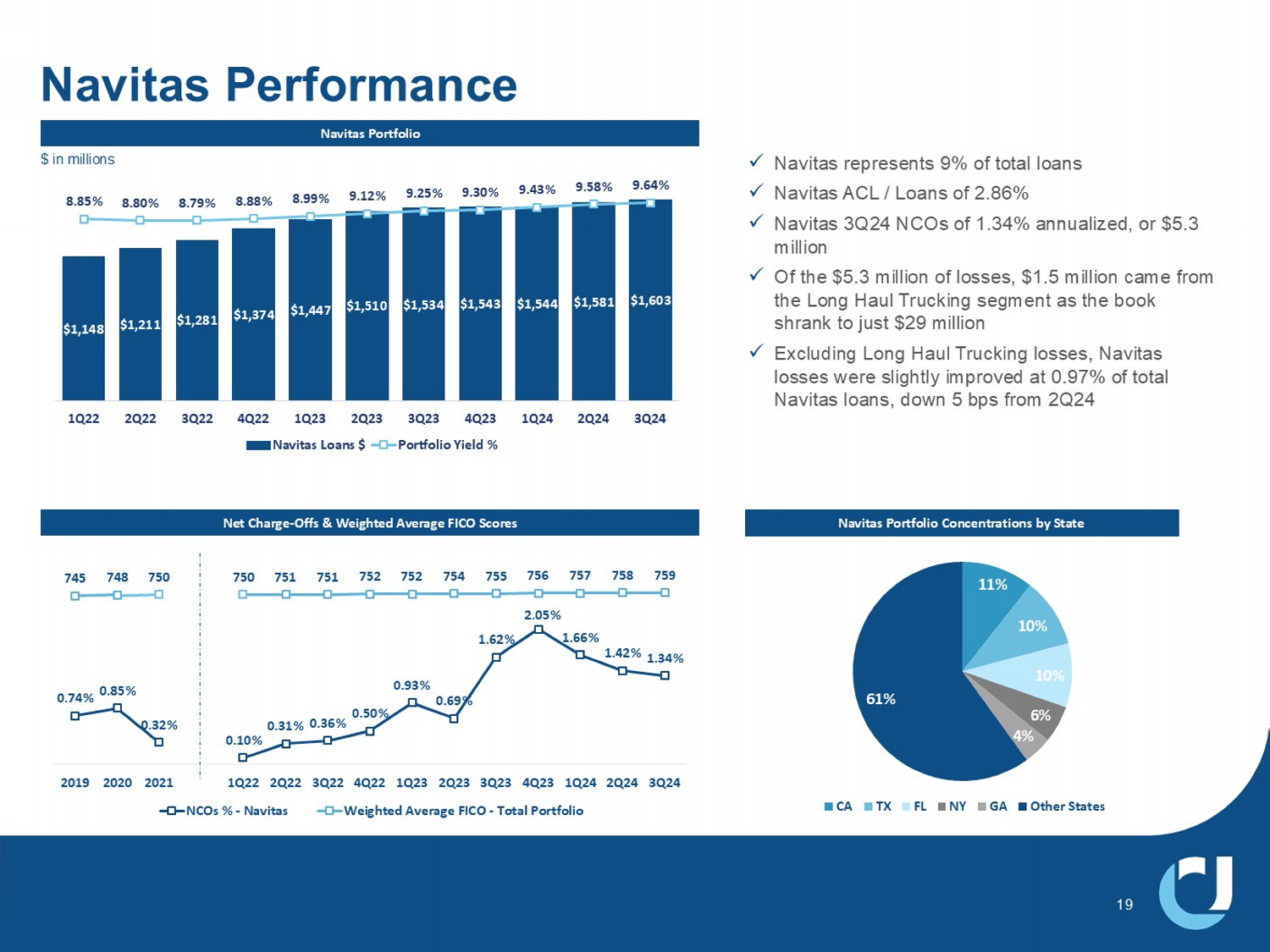 Navitas Portfolio Net Charge - Offs & Weighted Average FICO Scores x Navitas represents 9% of total loans x Navitas ACL / Loans of 2.86% x Navitas 3Q24 NCOs of 1.34% annualized, or $5.3 million x Of the $5.3 million of losses, $1.5 million came from the Long Haul Trucking segment as the book shrank to just $29 million x Excluding Long Haul Trucking losses, Navitas losses were slightly improved at 0.97% of total Navitas loans, down 5 bps from 2Q24 Navitas Performance $1,148 $1,211 $1,281 $1,374 $1,447 $1,510 $1,534 $1,543 $1,544 $1,581 $1,603 8.85% 8.80% 8.79% 8.88% 8.99% 9.12% 9.25% 9.30% 9.43% 9.58% 9.64% 0.00% 2.00% 4.00% 6.00% 8.00% 10.00% $0 $200 $400 $600 $800 $1,000 $1,200 $1,400 $1,600 $1,800 1Q22 2Q22 3Q22 4Q22 1Q23 2Q23 3Q23 4Q23 1Q24 2Q24 3Q24 Navitas Loans $ Portfolio Yield % 19 0.74% 0.85% 0.32% 0.10% 0.31% 0.36% 0.50% 0.93% 0.69% 1.62% 2.05% 1.66% 1.42% 1.34% 745 748 750 750 751 751 752 752 754 755 756 757 758 759 1 101 201 301 401 501 601 701 801 0.00% 0.50% 1.00% 1.50% 2.00% 2.50% 3.00% 2019 2020 2021 1Q22 2Q22 3Q22 4Q22 1Q23 2Q23 3Q23 4Q23 1Q24 2Q24 3Q24 NCOs % - Navitas Weighted Average FICO - Total Portfolio $ in millions Navitas Portfolio Concentrations by State 11% 10% 10% 6% 4% 61% CA TX FL NY GA Other StatesJH0CA1