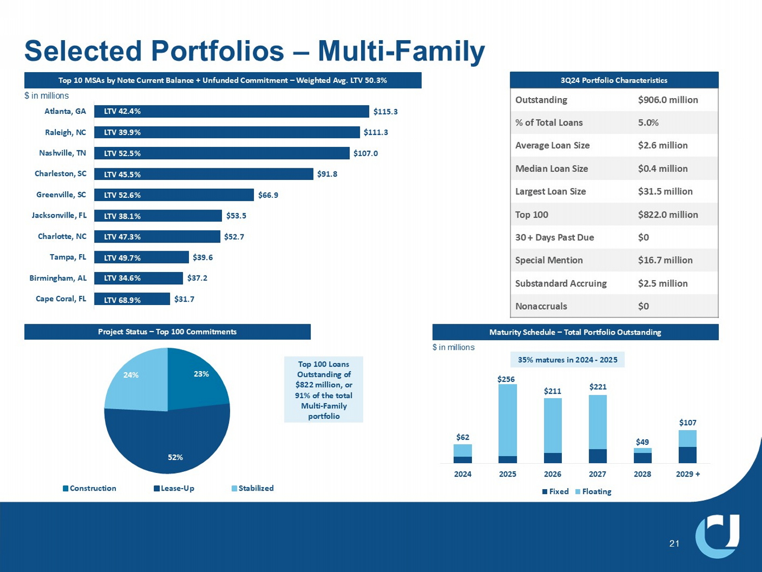 1% 20% 25% 49% 6% Selected Portfolios – Office 20 3Q24 Portfolio Characteristics Top 10 MSAs by Note Current Balance + Unfunded Commitment – Weighted Avg. LTV 61.7% $ in millions $ in millions $19.8 $25.4 $32.6 $39.2 $42.4 $48.6 $58.5 $68.5 $98.9 $122.4 Ft. Lauderdale, FL Charlotte, NC Nashville, TN Chattanooga, TN Greenville, SC Orlando, FL Raleigh, NC Miami, FL Charleston, SC Atlanta, GA LTV 61.9% LTV 62.8% LTV 44.1% LTV 65.9% LTV 66.3% LTV 65.7% LTV 70.6% LTV 74.1% LTV 59.0% Collateral Type – Top 100 Outstanding Location Segment – Top 100 Outstanding Maturity Schedule – Total Portfolio Outstanding $810.0 million Outstanding 4.5% % of Total Loans $1.4 million Average Loan Size $0.6 million Median Loan Size $16.0 million Largest Loan Size $481.6 million Top 100 $173 thousand 30 + Days Past Due $12.3 million Special Mention $23.2 million Substandard Accruing $0 Nonaccruals LTV 60.6% 37% 63% Medical Office Non-Medical Office 7% 12% 2% 79% CBD - Class A CBD - Class B CBD - Class C Non-CBD $35 $104 $121 $86 $97 $367 2024 2025 2026 2027 2028 2029 + Fixed Floating 17% matures in 2024 - 2025 $ in millions Top 100 Loans Outstanding of $481 million, or 59% of the total Office portfolioCA0 EB1 EB2 EB3 EB4