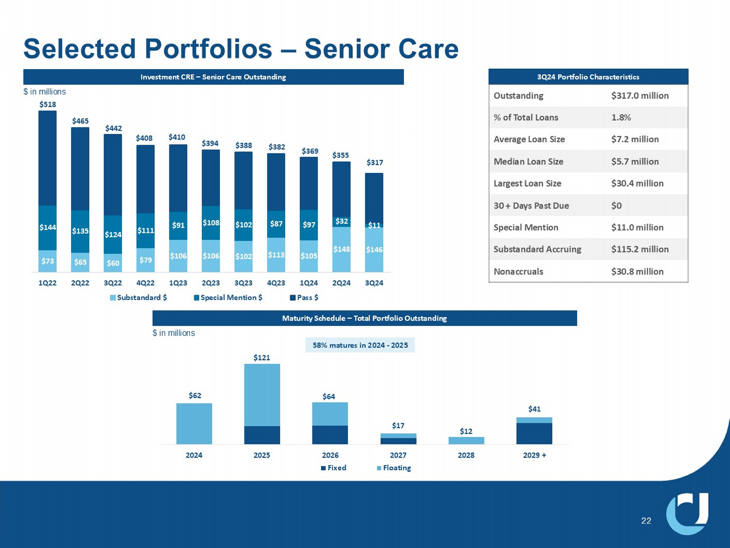 23% 52% 24% Construction Lease-Up Stabilized $31.7 $37.2 $39.6 $52.7 $53.5 $66.9 $91.8 $107.0 $111.3 $115.3 Cape Coral, FL Birmingham, AL Tampa, FL Charlotte, NC Jacksonville, FL Greenville, SC Charleston, SC Nashville, TN Raleigh, NC Atlanta, GA 1% 20% 25% 49% 6% Selected Portfolios – Multi - Family 21 3Q24 Portfolio Characteristics $ in millions LTV 42.4% LTV 39.9% LTV 45.5% LTV 52.6% LTV 38.1% LTV 47.3% LTV 49.7% LTV 68.9% Project Status – Top 100 Commitments Maturity Schedule – Total Portfolio Outstanding $906.0 million Outstanding 5.0% % of Total Loans $2.6 million Average Loan Size $0.4 million Median Loan Size $31.5 million Largest Loan Size $822.0 million Top 100 $0 30 + Days Past Due $16.7 million Special Mention $2.5 million Substandard Accruing $0 Nonaccruals LTV 34.6% $62 $256 $211 $221 $49 $107 2024 2025 2026 2027 2028 2029 + Fixed Floating 35% matures in 2024 - 2025 $ in millions Top 10 MSAs by Note Current Balance + Unfunded Commitment – Weighted Avg. LTV 50.3% Top 100 Loans Outstanding of $822 million, or 91% of the total Multi - Family portfolio LTV 52.5% CA0EB1 EB2 EB3