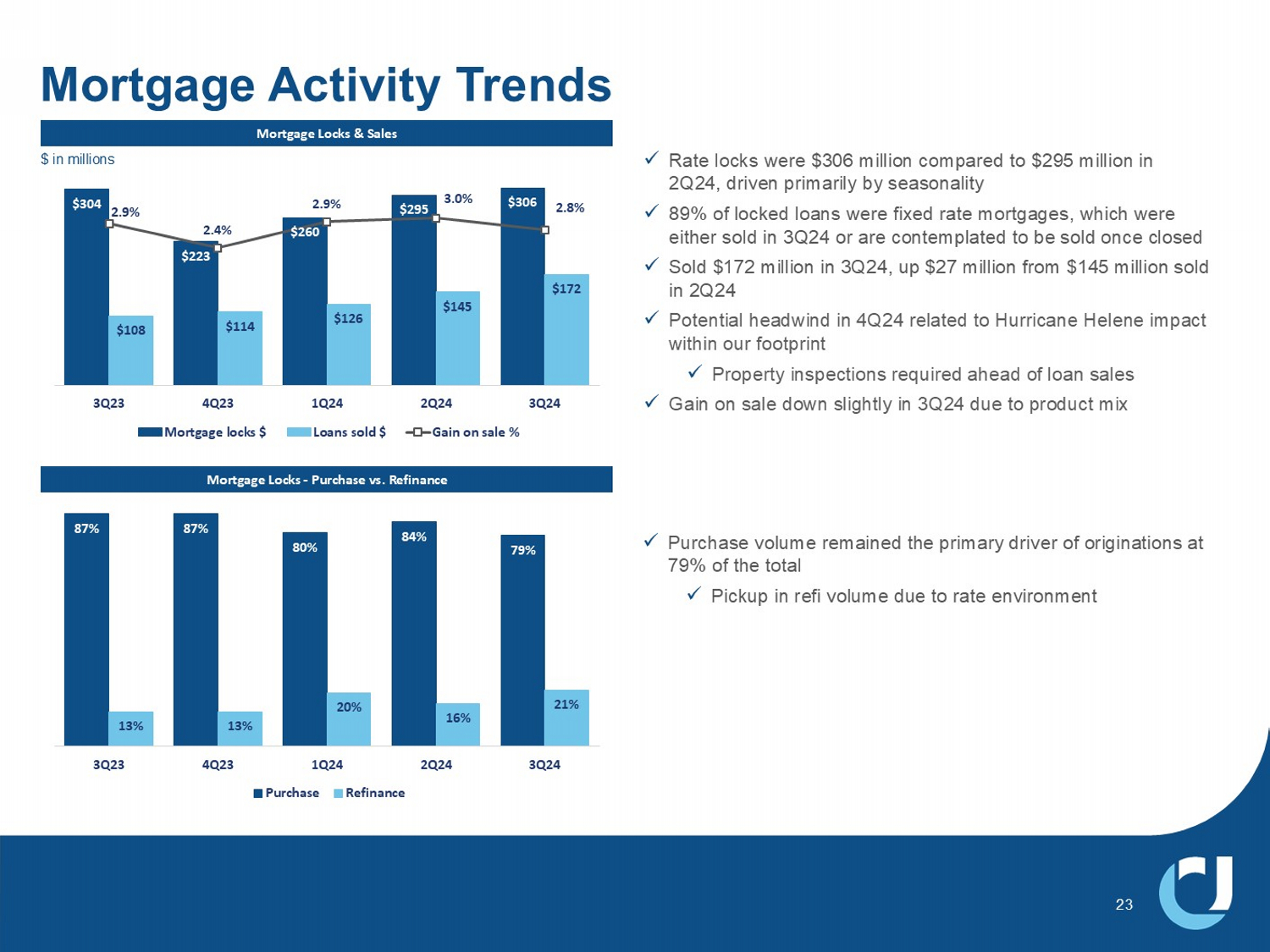 x Rate locks were $306 million compared to $295 million in 2Q24, driven primarily by seasonality x 89% of locked loans were fixed rate mortgages, which were either sold in 3Q24 or are contemplated to be sold once closed x Sold $172 million in 3Q24, up $27 million from $145 million sold in 2Q24 x Potential headwind in 4Q24 related to Hurricane Helene impact within our footprint x Property inspections required ahead of loan sales x Gain on sale down slightly in 3Q24 due to product mix Mortgage Locks & Sales Mortgage Locks - Purchase vs. Refinance Mortgage Activity Trends $304 $223 $260 $295 $306 $108 $114 $126 $145 $172 2.9% 2.4% 2.9% 3.0% 2.8% 0.00% 0.50% 1.00% 1.50% 2.00% 2.50% 3.00% 3.50% 4.00% $0 $50 $100 $150 $200 $250 $300 $350 3Q23 4Q23 1Q24 2Q24 3Q24 Mortgage locks $ Loans sold $ Gain on sale % 87% 87% 80% 84% 79% 13% 13% 20% 16% 21% 3Q23 4Q23 1Q24 2Q24 3Q24 Purchase Refinance 23 x Purchase volume remained the primary driver of originations at 79% of the total x Pickup in refi volume due to rate environment $ in millions