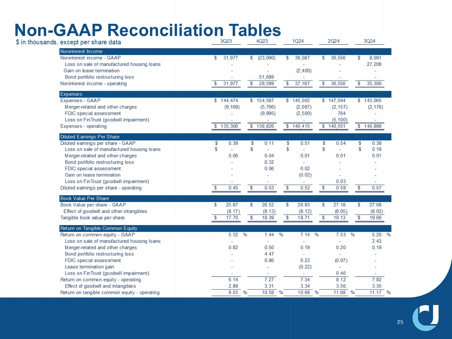 Non - GAAP Reconciliation Tables 26 3Q23 4Q23 1Q24 2Q24 3Q24 Return on Assets Return on assets - GAAP 0.68 % 0.18 % 0.90 % 0.97 % 0.67 % Loss on sale of manufactured housing loans - - - - 0.31 Merger-related and other charges - 0.06 0.03 0.01 0.03 Bond portfolio restructuring loss - 0.57 - - - FDIC special assessment 0.11 0.11 0.03 - - Lease termination gain - - (0.03) - - Loss on FinTrust (goodwill impairment) - - - 0.06 - Return on assets - operating 0.79 % 0.92 % 0.93 % 1.04 % 1.01 % Return on Assets to Return on Assets - Pre-tax Pre-provision Return on assets - GAAP 0.68 % 0.18 % 0.90 % 0.97 % 0.67 % Income tax expense (benefit) 0.18 (0.04) 0.27 0.29 0.19 (Release of) provision for credit losses 0.45 0.21 0.19 0.18 0.21 Return on assets - pre-tax, pre-provision 1.31 0.35 1.36 1.44 1.07 Loss on sale of manufactured housing loans - - - - 0.40 Merger-related and other charges 0.13 0.08 0.04 0.03 0.03 Bond portfolio restructuring loss - 0.75 - - - FDIC special assessment - 0.15 0.04 (0.01) - Lease termination gain - - (0.04) - - Loss on FinTrust (goodwill impairment) - - - 0.08 - Return on assets - pre-tax pre-provision - operating 1.44 % 1.33 % 1.40 % 1.54 % 1.50 % Efficiency Ratio Efficiency ratio - GAAP 61.32 % 66.33 % 60.47 % 59.70 % 65.51 % Loss on sale of manufactured housing loans - - - - (7.15) Merger-related and other charges (3.89) (2.47) (0.87) (0.88) (0.99) FDIC special assessment - (4.29) (1.05) 0.31 - Lease termination gain - - 0.60 - - Loss on FinTrust (goodwill impairment) - - - (2.07) - Efficiency ratio - operating 57.43 % 59.57 % 59.15 % 57.06 % 57.37 % Tangible Common Equity to Tangible Assets Equity to assets ratio - GAAP 11.85 % 11.95 % 12.06 % 12.35 % 12.45 % Effect of goodwill and intangibles (3.33) (3.27) (3.25) (3.24) (3.20) Effect of preferred equity (0.34) (0.32) (0.32) (0.33) (0.32) Tangible common equity to tangible assets 8.18 % 8.36 % 8.49 % 8.78 % 8.93 % $ in thousands, except per share data