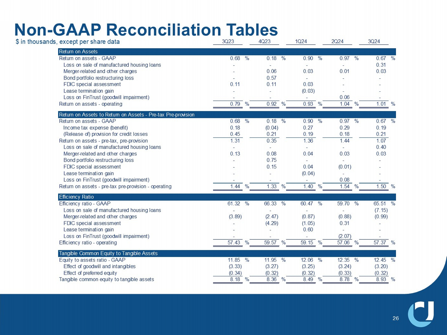 Non - GAAP Reconciliation Tables 25 3Q23 4Q23 1Q24 2Q24 3Q24 Noninterest Income Noninterest income - GAAP 31,977$ (23,090)$ 39,587$ 36,556$ 8,091$ Loss on sale of manufactured housing loans - - - - 27,209 Gain on lease termination - - (2,400) - - Bond portfolio restructuring loss - 51,689 - - - Noninterest income - operating 31,977$ 28,599$ 37,187$ 36,556$ 35,300$ Expenses Expenses - GAAP 144,474$ 154,587$ 145,002$ 147,044$ 143,065$ Merger-related and other charges (9,168) (5,766) (2,087) (2,157) (2,176) FDIC special assessment - (9,995) (2,500) 764 - Loss on FinTrust (goodwill impairment) - - - (5,100) - Expenses - operating 135,306$ 138,826$ 140,415$ 140,551$ 140,889$ Diluted Earnings Per Share Diluted earnings per share - GAAP 0.39$ 0.11$ 0.51$ 0.54$ 0.38$ Loss on sale of manufactured housing loans -$ -$ -$ -$ 0.18$ Merger-related and other charges 0.06 0.04 0.01 0.01 0.01 Bond portfolio restructuring loss - 0.32 - - - FDIC special assessment - 0.06 0.02 - - Gain on lease termination - - (0.02) - - Loss on FinTrust (goodwill impairment) - - - 0.03 - Diluted earnings per share - operating 0.45$ 0.53$ 0.52$ 0.58$ 0.57$ Book Value Per Share Book Value per share - GAAP 25.87$ 26.52$ 26.83$ 27.18$ 27.68$ Effect of goodwill and other intangibles (8.17) (8.13) (8.12) (8.05) (8.02) Tangible book value per share 17.70$ 18.39$ 18.71$ 19.13$ 19.66$ Return on Tangible Common Equity Return on common equity - GAAP 5.32 % 1.44 % 7.14 % 7.53 % 5.20 % Loss on sale of manufactured housing loans - - - - 2.43 Merger-related and other charges 0.82 0.50 0.19 0.20 0.19 Bond portfolio restructuring loss - 4.47 - - - FDIC special assessment - 0.86 0.23 (0.07) - Lease termination gain - - (0.22) - - Loss on FinTrust (goodwill impairment) - - - 0.46 - Return on common equity - operating 6.14 7.27 7.34 8.12 7.82 Effect of goodwill and intangibles 2.89 3.31 3.34 3.56 3.35 Return on tangible common equity - operating 9.03 % 10.58 % 10.68 % 11.68 % 11.17 % $ in thousands, except per share data EB0