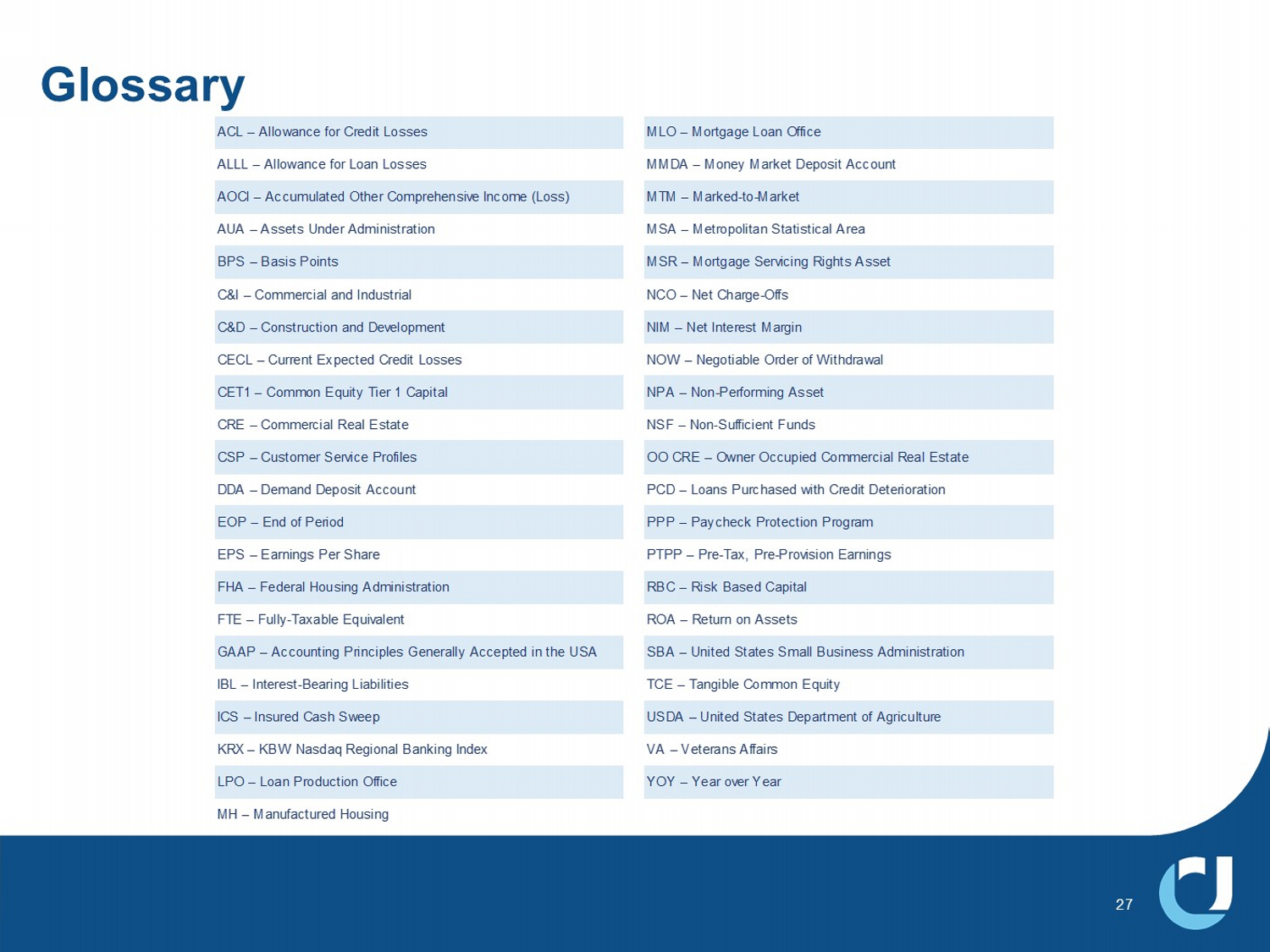 Glossary ACL – Allowance for Credit Losses MLO – Mortgage Loan Office ALLL – Allowance for Loan Losses MMDA – Money Market Deposit Account AOCI – Accumulated Other Comprehensive Income (Loss) MTM – Marked-to-Market AUA – Assets Under Administration MSA – Metropolitan Statistical Area BPS – Basis Points MSR – Mortgage Servicing Rights Asset C&I – Commercial and Industrial NCO – Net Charge-Offs C&D – Construction and Development NIM – Net Interest Margin CECL – Current Expected Credit Losses NOW – Negotiable Order of Withdrawal CET1 – Common Equity Tier 1 Capital NPA – Non-Performing Asset CRE – Commercial Real Estate NSF – Non-Sufficient Funds CSP – Customer Service Profiles OO CRE – Owner Occupied Commercial Real Estate DDA – Demand Deposit Account PCD – Loans Purchased with Credit Deterioration EOP – End of Period PPP – Paycheck Protection Program EPS – Earnings Per Share PTPP – Pre-Tax, Pre-Provision Earnings FHA – Federal Housing Administration RBC – Risk Based Capital FTE – Fully-Taxable Equivalent ROA – Return on Assets GAAP – Accounting Principles Generally Accepted in the USA SBA – United States Small Business Administration IBL – Interest-Bearing Liabilities TCE – Tangible Common Equity ICS – Insured Cash Sweep USDA – United States Department of Agriculture KRX – KBW Nasdaq Regional Banking Index VA – Veterans Affairs LPO – Loan Production Office YOY – Year over Year MH – Manufactured Housing 27