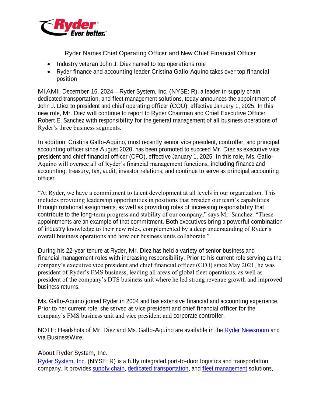 Ryder Names Chief Operating Officer and New Chief Financial Officer • Industry veteran John J. Diez named to top operations role • Ryder finance and accounting leader Cristina Gallo-Aquino takes over top financial position MIAMI, December 16, 2024—Ryder System, Inc. (NYSE: R), a leader in supply chain, dedicated transportation, and fleet management solutions, today announces the appointment of John J. Diez to president and chief operating officer (COO), effective January 1, 2025. In this new role, Mr. Diez will continue to report to Ryder Chairman and Chief Executive Officer Robert E. Sanchez with responsibility for the general management of all business operations of Ryder’s three business segments. In addition, Cristina Gallo-Aquino, most recently senior vice president, controller, and principal accounting officer since August 2020, has been promoted to succeed Mr. Diez as executive vice president and chief financial officer (CFO), effective January 1, 2025. In this role, Ms. Gallo- Aquino will oversee all of Ryder’s financial management functions, including finance and accounting, treasury, tax, audit, investor relations, and continue to serve as principal accounting officer. “At Ryder, we have a commitment to talent development at all levels in our organization. This includes providing leadership opportunities in positions that broaden our team’s capabilities through rotational assignments, as well as providing roles of increasing responsibility that contribute to the long-term progress and stability of our company,” says Mr. Sanchez. “These appointments are an example of that commitment. Both executives bring a powerful combination of industry knowledge to their new roles, complemented by a deep understanding of Ryder’s overall business operations and how our business units collaborate.” During his 22-year tenure at Ryder, Mr. Diez has held a variety of senior business and financial management roles with increasing responsibility. Prior to his current role serving as the company’s executive vice president and chief financial officer (CFO) since May 2021, he was president of Ryder’s FMS business, leading all areas of global fleet operations, as well as president of the company’s DTS business unit where he led strong revenue growth and improved business returns. Ms. Gallo-Aquino joined Ryder in 2004 and has extensive financial and accounting experience. Prior to her current role, she served as vice president and chief financial officer for the company’s FMS business unit and vice president and corporate controller. NOTE: Headshots of Mr. Diez and Ms. Gallo-Aquino are available in the Ryder Newsroom and via BusinessWire. About Ryder System, Inc. Ryder System, Inc. (NYSE: R) is a fully integrated port-to-door logistics and transportation company. It provides supply chain, dedicated transportation, and fleet management solutions,