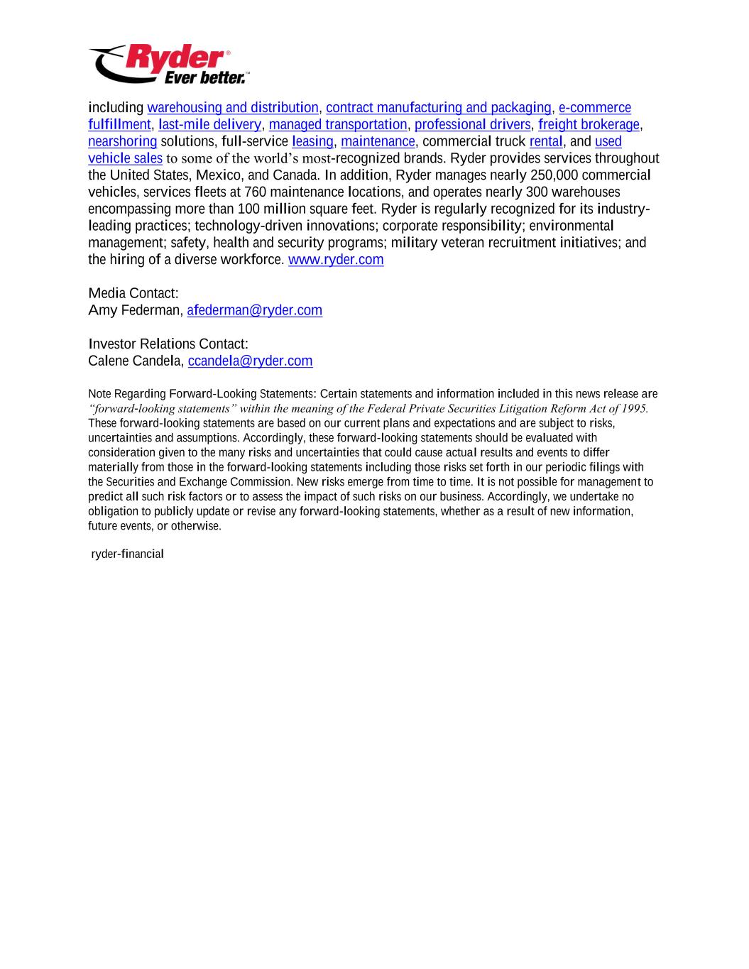 including warehousing and distribution, contract manufacturing and packaging, e-commerce fulfillment, last-mile delivery, managed transportation, professional drivers, freight brokerage, nearshoring solutions, full-service leasing, maintenance, commercial truck rental, and used vehicle sales to some of the world’s most-recognized brands. Ryder provides services throughout the United States, Mexico, and Canada. In addition, Ryder manages nearly 250,000 commercial vehicles, services fleets at 760 maintenance locations, and operates nearly 300 warehouses encompassing more than 100 million square feet. Ryder is regularly recognized for its industry- leading practices; technology-driven innovations; corporate responsibility; environmental management; safety, health and security programs; military veteran recruitment initiatives; and the hiring of a diverse workforce. www.ryder.com Media Contact: Amy Federman, afederman@ryder.com Investor Relations Contact: Calene Candela, ccandela@ryder.com Note Regarding Forward-Looking Statements: Certain statements and information included in this news release are “forward-looking statements” within the meaning of the Federal Private Securities Litigation Reform Act of 1995. These forward-looking statements are based on our current plans and expectations and are subject to risks, uncertainties and assumptions. Accordingly, these forward-looking statements should be evaluated with consideration given to the many risks and uncertainties that could cause actual results and events to differ materially from those in the forward-looking statements including those risks set forth in our periodic filings with the Securities and Exchange Commission. New risks emerge from time to time. It is not possible for management to predict all such risk factors or to assess the impact of such risks on our business. Accordingly, we undertake no obligation to publicly update or revise any forward-looking statements, whether as a result of new information, future events, or otherwise. ryder-financial