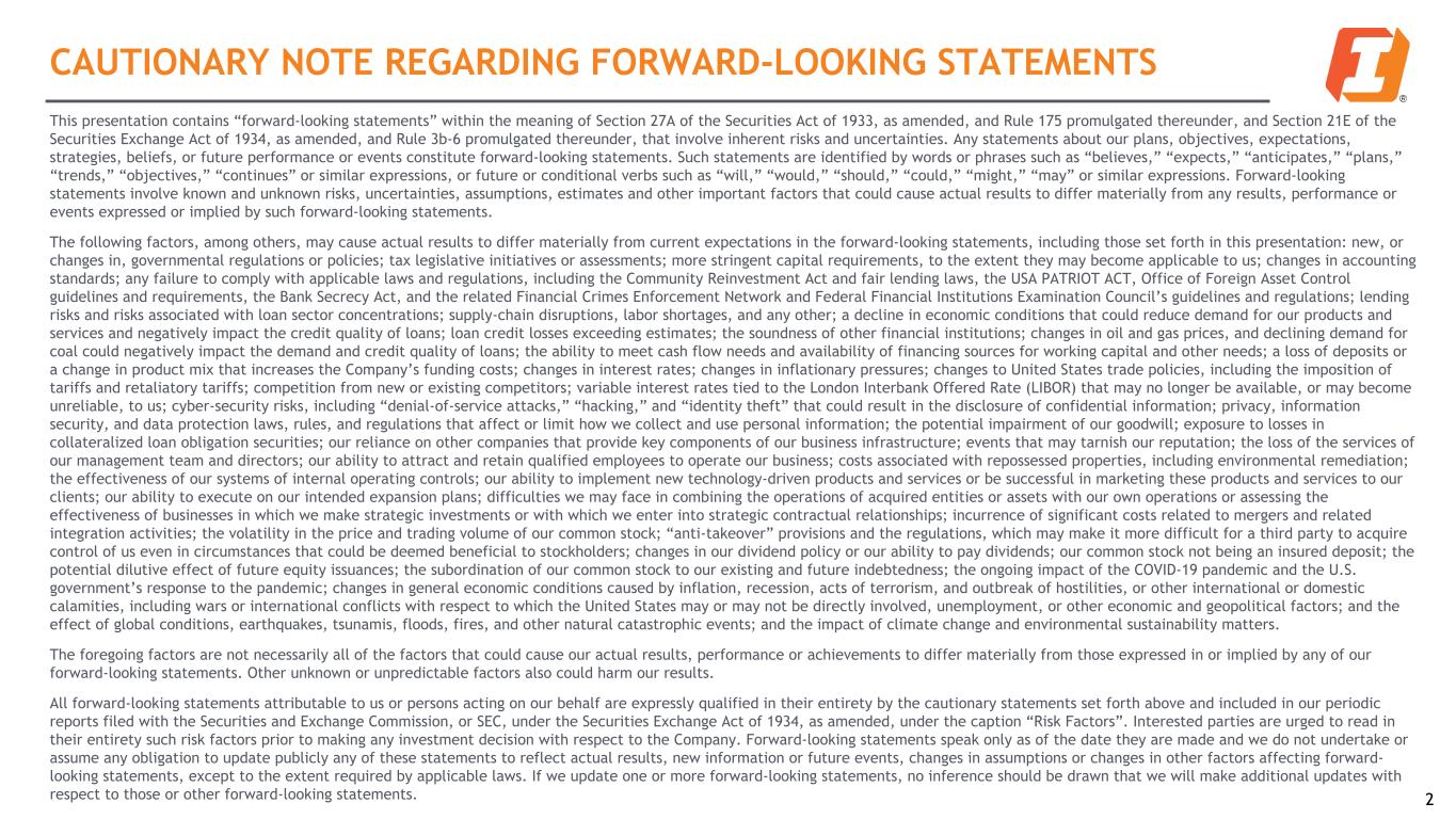 CAUTIONARY NOTE REGARDING FORWARD-LOOKING STATEMENTS This presentation contains “forward-looking statements” within the meaning of Section 27A of the Securities Act of 1933, as amended, and Rule 175 promulgated thereunder, and Section 21E of the Securities Exchange Act of 1934, as amended, and Rule 3b-6 promulgated thereunder, that involve inherent risks and uncertainties. Any statements about our plans, objectives, expectations, strategies, beliefs, or future performance or events constitute forward-looking statements. Such statements are identified by words or phrases such as “believes,” “expects,” “anticipates,” “plans,” “trends,” “objectives,” “continues” or similar expressions, or future or conditional verbs such as “will,” “would,” “should,” “could,” “might,” “may” or similar expressions. Forward-looking statements involve known and unknown risks, uncertainties, assumptions, estimates and other important factors that could cause actual results to differ materially from any results, performance or events expressed or implied by such forward-looking statements. The following factors, among others, may cause actual results to differ materially from current expectations in the forward-looking statements, including those set forth in this presentation: new, or changes in, governmental regulations or policies; tax legislative initiatives or assessments; more stringent capital requirements, to the extent they may become applicable to us; changes in accounting standards; any failure to comply with applicable laws and regulations, including the Community Reinvestment Act and fair lending laws, the USA PATRIOT ACT, Office of Foreign Asset Control guidelines and requirements, the Bank Secrecy Act, and the related Financial Crimes Enforcement Network and Federal Financial Institutions Examination Council’s guidelines and regulations; lending risks and risks associated with loan sector concentrations; supply-chain disruptions, labor shortages, and any other; a decline in economic conditions that could reduce demand for our products and services and negatively impact the credit quality of loans; loan credit losses exceeding estimates; the soundness of other financial institutions; changes in oil and gas prices, and declining demand for coal could negatively impact the demand and credit quality of loans; the ability to meet cash flow needs and availability of financing sources for working capital and other needs; a loss of deposits or a change in product mix that increases the Company’s funding costs; changes in interest rates; changes in inflationary pressures; changes to United States trade policies, including the imposition of tariffs and retaliatory tariffs; competition from new or existing competitors; variable interest rates tied to the London Interbank Offered Rate (LIBOR) that may no longer be available, or may become unreliable, to us; cyber-security risks, including “denial-of-service attacks,” “hacking,” and “identity theft” that could result in the disclosure of confidential information; privacy, information security, and data protection laws, rules, and regulations that affect or limit how we collect and use personal information; the potential impairment of our goodwill; exposure to losses in collateralized loan obligation securities; our reliance on other companies that provide key components of our business infrastructure; events that may tarnish our reputation; the loss of the services of our management team and directors; our ability to attract and retain qualified employees to operate our business; costs associated with repossessed properties, including environmental remediation; the effectiveness of our systems of internal operating controls; our ability to implement new technology-driven products and services or be successful in marketing these products and services to our clients; our ability to execute on our intended expansion plans; difficulties we may face in combining the operations of acquired entities or assets with our own operations or assessing the effectiveness of businesses in which we make strategic investments or with which we enter into strategic contractual relationships; incurrence of significant costs related to mergers and related integration activities; the volatility in the price and trading volume of our common stock; “anti-takeover” provisions and the regulations, which may make it more difficult for a third party to acquire control of us even in circumstances that could be deemed beneficial to stockholders; changes in our dividend policy or our ability to pay dividends; our common stock not being an insured deposit; the potential dilutive effect of future equity issuances; the subordination of our common stock to our existing and future indebtedness; the ongoing impact of the COVID-19 pandemic and the U.S. government’s response to the pandemic; changes in general economic conditions caused by inflation, recession, acts of terrorism, and outbreak of hostilities, or other international or domestic calamities, including wars or international conflicts with respect to which the United States may or may not be directly involved, unemployment, or other economic and geopolitical factors; and the effect of global conditions, earthquakes, tsunamis, floods, fires, and other natural catastrophic events; and the impact of climate change and environmental sustainability matters. The foregoing factors are not necessarily all of the factors that could cause our actual results, performance or achievements to differ materially from those expressed in or implied by any of our forward-looking statements. Other unknown or unpredictable factors also could harm our results. All forward-looking statements attributable to us or persons acting on our behalf are expressly qualified in their entirety by the cautionary statements set forth above and included in our periodic reports filed with the Securi