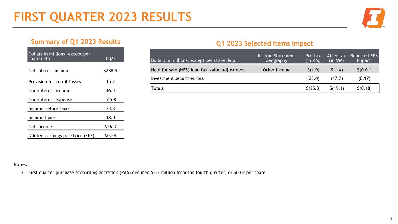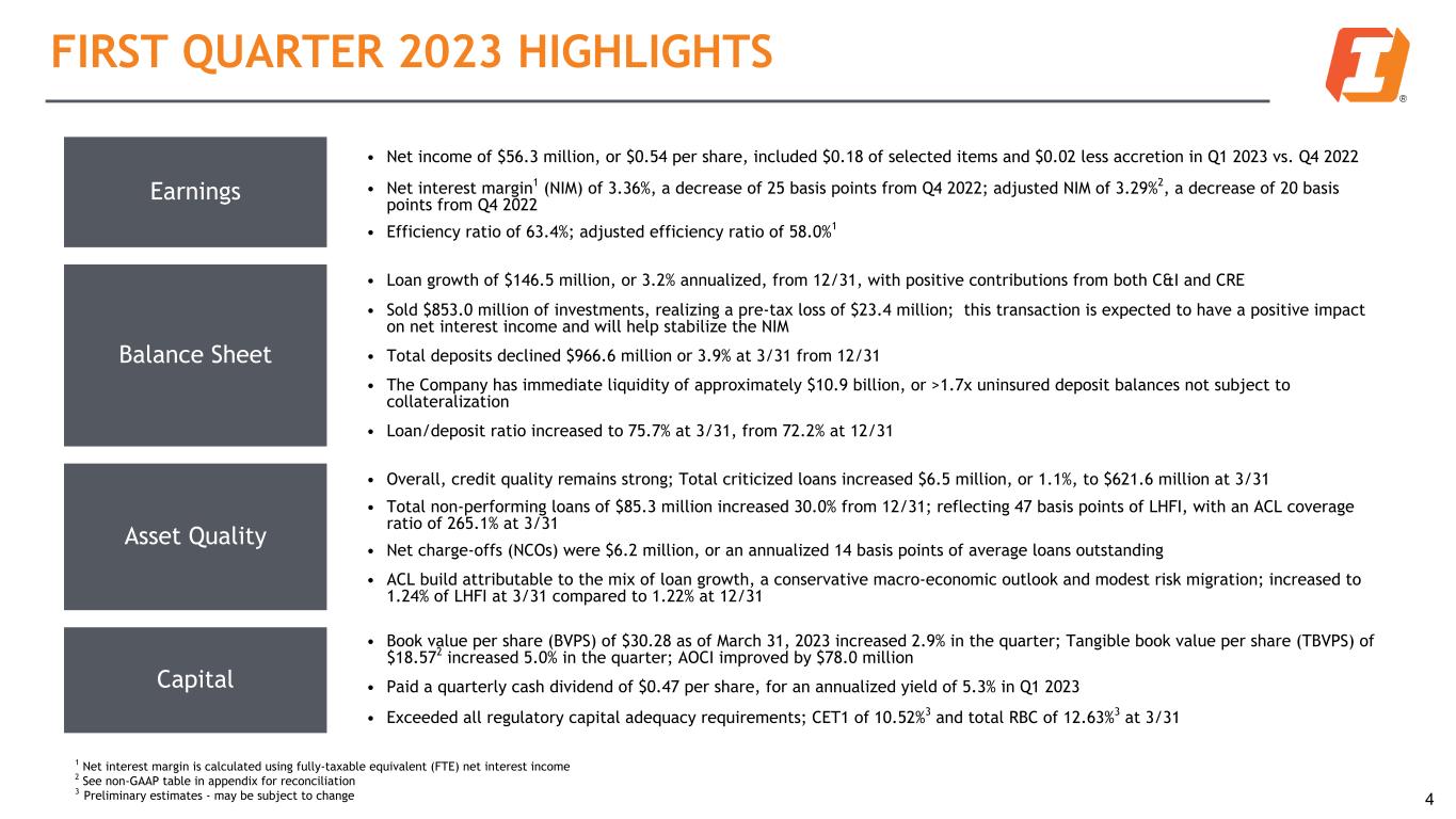 FIRST QUARTER 2023 HIGHLIGHTS Earnings • Net income of $56.3 million, or $0.54 per share, included $0.18 of selected items and $0.02 less accretion in Q1 2023 vs. Q4 2022 • Net interest margin1 (NIM) of 3.36%, a decrease of 25 basis points from Q4 2022; adjusted NIM of 3.29%2, a decrease of 20 basis points from Q4 2022 • Efficiency ratio of 63.4%; adjusted efficiency ratio of 58.0%1 Balance Sheet • Loan growth of $146.5 million, or 3.2% annualized, from 12/31, with positive contributions from both C&I and CRE • Sold $853.0 million of investments, realizing a pre-tax loss of $23.4 million; this transaction is expected to have a positive impact on net interest income and will help stabilize the NIM • Total deposits declined $966.6 million or 3.9% at 3/31 from 12/31 • The Company has immediate liquidity of approximately $10.9 billion, or >1.7x uninsured deposit balances not subject to collateralization • Loan/deposit ratio increased to 75.7% at 3/31, from 72.2% at 12/31 Asset Quality • Overall, credit quality remains strong; Total criticized loans increased $6.5 million, or 1.1%, to $621.6 million at 3/31 • Total non-performing loans of $85.3 million increased 30.0% from 12/31; reflecting 47 basis points of LHFI, with an ACL coverage ratio of 265.1% at 3/31 • Net charge-offs (NCOs) were $6.2 million, or an annualized 14 basis points of average loans outstanding • ACL build attributable to the mix of loan growth, a conservative macro-economic outlook and modest risk migration; increased to 1.24% of LHFI at 3/31 compared to 1.22% at 12/31 Capital • Book value per share (BVPS) of $30.28 as of March 31, 2023 increased 2.9% in the quarter; Tangible book value per share (TBVPS) of $18.572 increased 5.0% in the quarter; AOCI improved by $78.0 million • Paid a quarterly cash dividend of $0.47 per share, for an annualized yield of 5.3% in Q1 2023 • Exceeded all regulatory capital adequacy requirements; CET1 of 10.52%3 and total RBC of 12.63%3 at 3/31 4 1 Net interest margin is calculated using fully-taxable equivalent (FTE) net interest income 2 See non-GAAP table in appendix for reconciliation 3 Preliminary estimates - may be subject to change