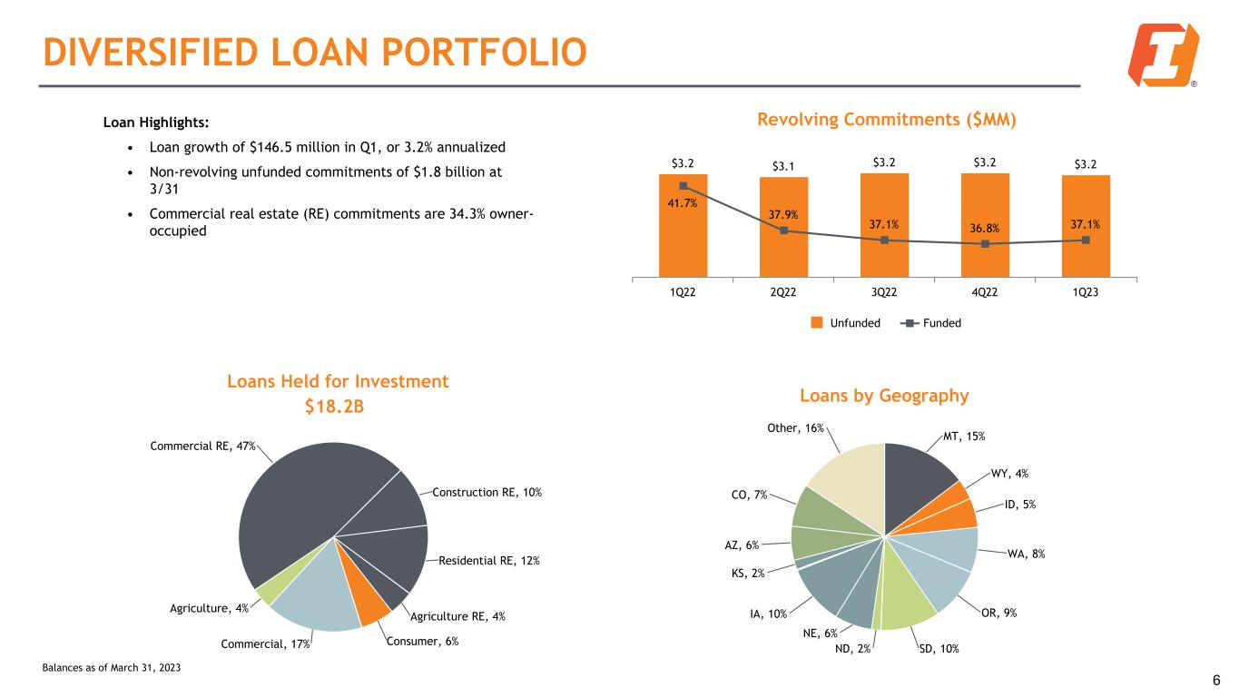 FIRST QUARTER 2023 RESULTS Summary of Q1 2023 Results Dollars in millions, except per share data 1Q23 Net interest income $238.9 Provision for credit losses 15.2 Non-interest income 16.4 Non-interest expense 165.8 Income before taxes 74.3 Income taxes 18.0 Net income $56.3 Diluted earnings per share (EPS) $0.54 Q1 2023 Selected items impact Dollars in millions, except per share data Income Statement Geography Pre-tax (in MM) After-tax (in MM) Reported EPS Impact Held for sale (HFS) loan fair value adjustment Other Income $(1.9) $(1.4) $(0.01) Investment securities loss (23.4) (17.7) (0.17) Totals $(25.3) $(19.1) $(0.18) 5 Notes: • First quarter purchase accounting accretion (PAA) declined $3.2 million from the fourth quarter, or $0.02 per share