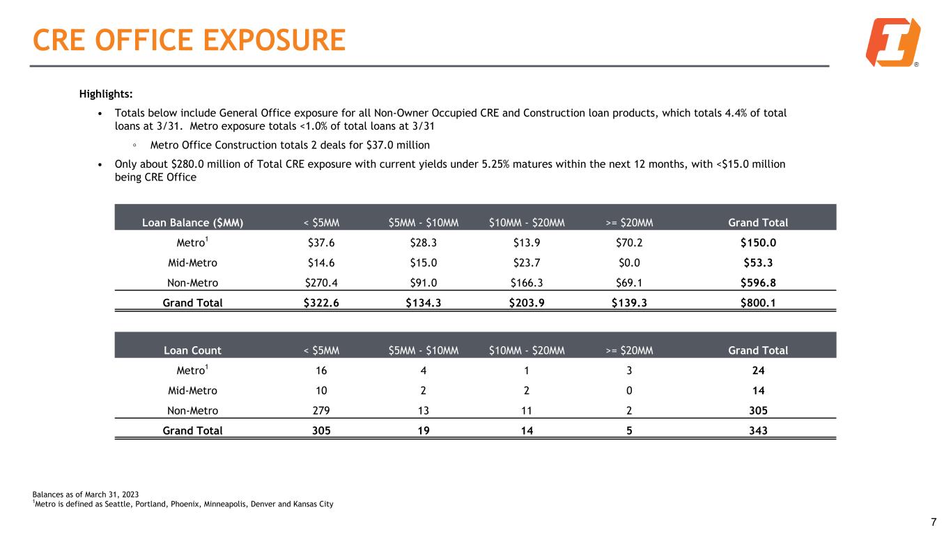 DIVERSIFIED LOAN PORTFOLIO Loans Held for Investment Commercial RE, 47% Construction RE, 10% Residential RE, 12% Agriculture RE, 4% Consumer, 6%Commercial, 17% Agriculture, 4% Loans by Geography MT, 15% WY, 4% ID, 5% WA, 8% OR, 9% SD, 10%ND, 2% NE, 6% IA, 10% KS, 2% AZ, 6% CO, 7% Other, 16% Revolving Commitments ($MM) $3.2 $3.1 $3.2 $3.2 $3.2 41.7% 37.9% 37.1% 36.8% 37.1% Unfunded Funded 1Q22 2Q22 3Q22 4Q22 1Q23 6 Loan Highlights: • Loan growth of $146.5 million in Q1, or 3.2% annualized • Non-revolving unfunded commitments of $1.8 billion at 3/31 • Commercial real estate (RE) commitments are 34.3% owner- occupied $18.2B Balances as of March 31, 2023
