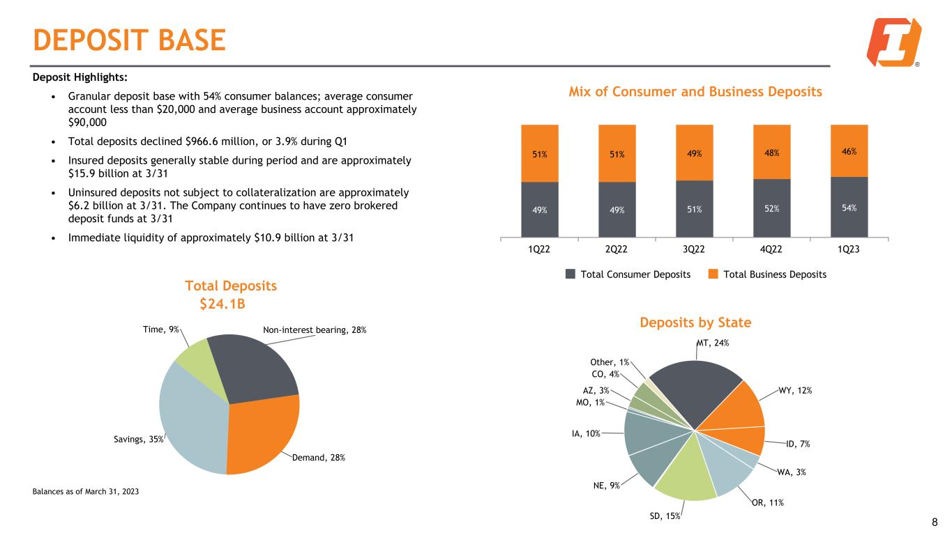 CRE OFFICE EXPOSURE 7 Highlights: • Totals below include General Office exposure for all Non-Owner Occupied CRE and Construction loan products, which totals 4.4% of total loans at 3/31. Metro exposure totals <1.0% of total loans at 3/31 ◦ Metro Office Construction totals 2 deals for $37.0 million • Only about $280.0 million of Total CRE exposure with current yields under 5.25% matures within the next 12 months, with <$15.0 million being CRE Office Balances as of March 31, 2023 1Metro is defined as Seattle, Portland, Phoenix, Minneapolis, Denver and Kansas City Loan Balance ($MM) < $5MM $5MM - $10MM $10MM - $20MM >= $20MM Grand Total Metro1 $37.6 $28.3 $13.9 $70.2 $150.0 Mid-Metro $14.6 $15.0 $23.7 $0.0 $53.3 Non-Metro $270.4 $91.0 $166.3 $69.1 $596.8 Grand Total $322.6 $134.3 $203.9 $139.3 $800.1 Loan Count < $5MM $5MM - $10MM $10MM - $20MM >= $20MM Grand Total Metro1 16 4 1 3 24 Mid-Metro 10 2 2 0 14 Non-Metro 279 13 11 2 305 Grand Total 305 19 14 5 343