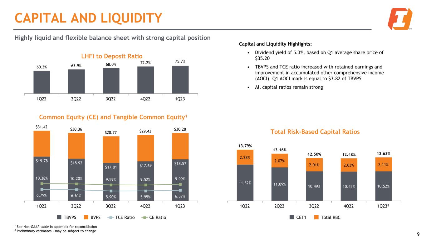 DEPOSIT BASE Total Deposits Non-interest bearing, 28% Demand, 28% Savings, 35% Time, 9% Deposits by State MT, 24% WY, 12% ID, 7% WA, 3% OR, 11% SD, 15% NE, 9% IA, 10% MO, 1% AZ, 3% CO, 4% Other, 1% Mix of Consumer and Business Deposits 49% 49% 51% 52% 54% 51% 51% 49% 48% 46% Total Consumer Deposits Total Business Deposits 1Q22 2Q22 3Q22 4Q22 1Q23 8 $24.1B Deposit Highlights: • Granular deposit base with 54% consumer balances; average consumer account less than $20,000 and average business account approximately $90,000 • Total deposits declined $966.6 million, or 3.9% during Q1 • Insured deposits generally stable during period and are approximately $15.9 billion at 3/31 • Uninsured deposits not subject to collateralization are approximately $6.2 billion at 3/31. The Company continues to have zero brokered deposit funds at 3/31 • Immediate liquidity of approximately $10.9 billion at 3/31 Balances as of March 31, 2023