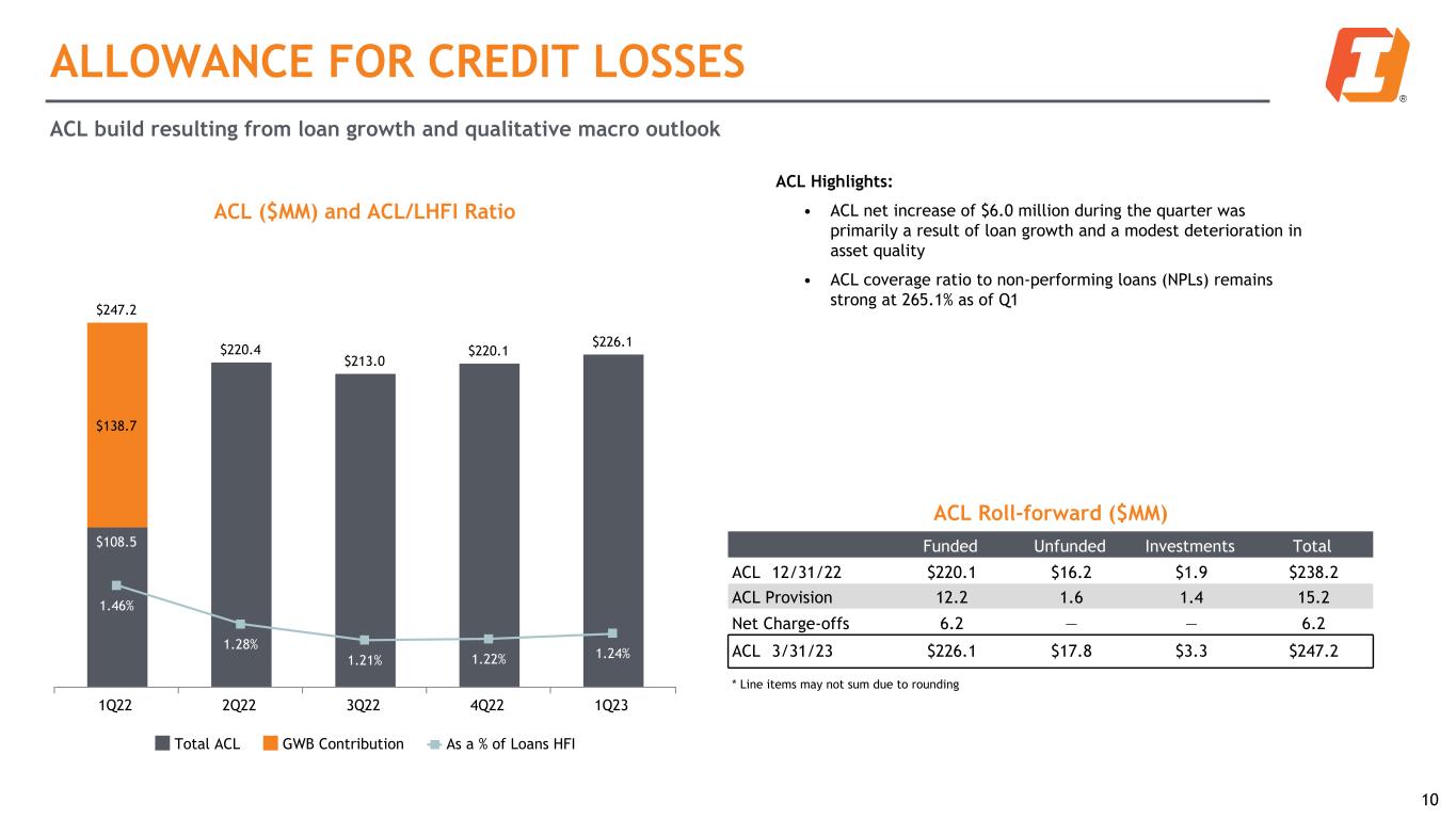 Total Risk-Based Capital Ratios 13.79% 13.16% 12.50% 12.48% 12.63% 11.52% 11.09% 10.49% 10.45% 10.52% 2.28% 2.07% 2.01% 2.03% 2.11% CET1 Total RBC 1Q22 2Q22 3Q22 4Q22 1Q23² CAPITAL AND LIQUIDITY Highly liquid and flexible balance sheet with strong capital position Common Equity (CE) and Tangible Common Equity¹ $31.42 $30.36 $28.77 $29.43 $30.28 $19.78 $18.92 $17.01 $17.69 $18.57 6.79% 6.61% 5.90% 5.95% 6.37% 10.38% 10.20% 9.59% 9.52% 9.99% TBVPS BVPS TCE Ratio CE Ratio 1Q22 2Q22 3Q22 4Q22 1Q23 9 LHFI to Deposit Ratio 60.3% 63.9% 68.0% 72.2% 75.7% 1Q22 2Q22 3Q22 4Q22 1Q23 Capital and Liquidity Highlights: • Dividend yield of 5.3%, based on Q1 average share price of $35.20 • TBVPS and TCE ratio increased with retained earnings and improvement in accumulated other comprehensive income (AOCI). Q1 AOCI mark is equal to $3.82 of TBVPS • All capital ratios remain strong 1 See Non-GAAP table in appendix for reconciliation 2 Preliminary estimates - may be subject to change
