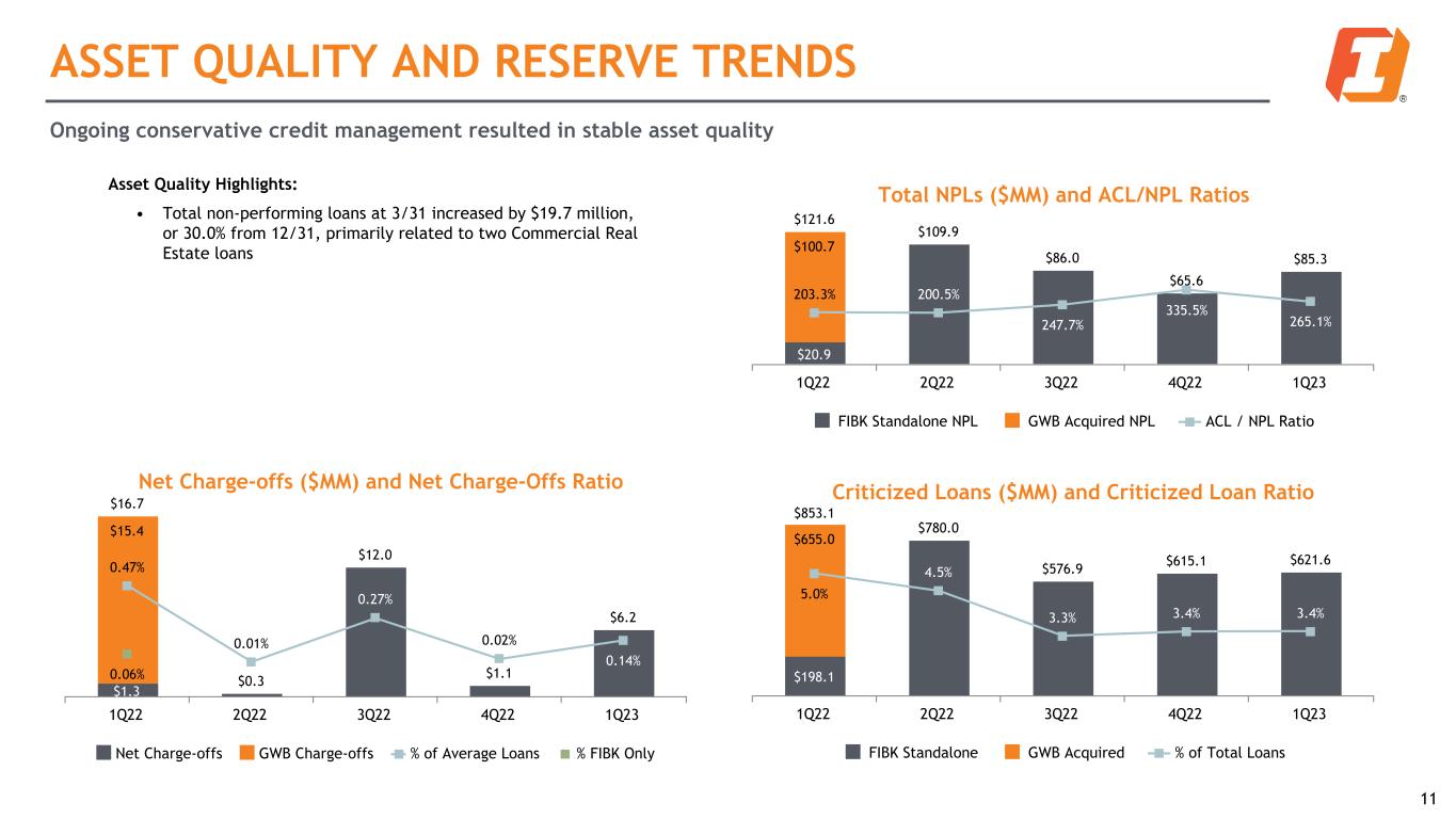 ALLOWANCE FOR CREDIT LOSSES ACL ($MM) and ACL/LHFI Ratio $247.2 $220.4 $213.0 $220.1 $226.1 $108.5 $138.7 1.46% 1.28% 1.21% 1.22% 1.24% Total ACL GWB Contribution As a % of Loans HFI 1Q22 2Q22 3Q22 4Q22 1Q23 10 ACL build resulting from loan growth and qualitative macro outlook ACL Highlights: • ACL net increase of $6.0 million during the quarter was primarily a result of loan growth and a modest deterioration in asset quality • ACL coverage ratio to non-performing loans (NPLs) remains strong at 265.1% as of Q1 ACL Roll-forward ($MM) Funded Unfunded Investments Total ACL 12/31/22 $220.1 $16.2 $1.9 $238.2 ACL Provision 12.2 1.6 1.4 15.2 Net Charge-offs 6.2 — — 6.2 ACL 3/31/23 $226.1 $17.8 $3.3 $247.2 * Line items may not sum due to rounding